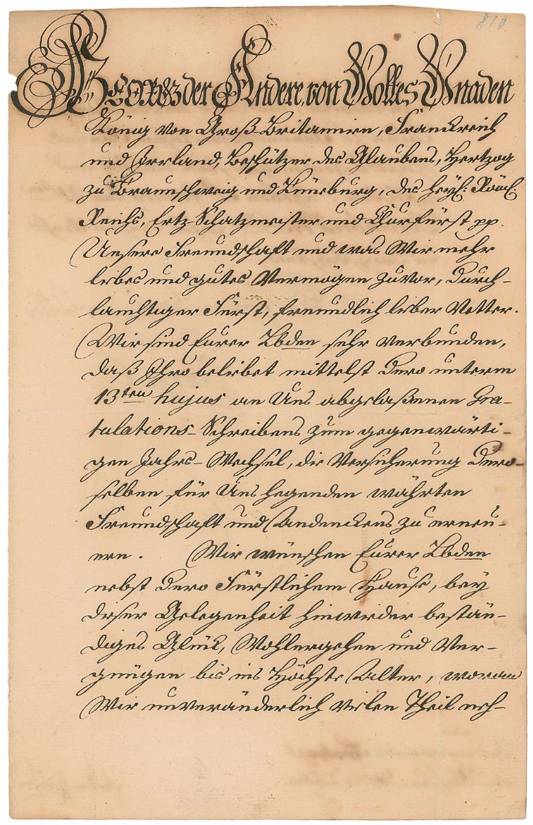 LS in German, signed “George R,” one page both sides, 8 x 12.5, December 31, 1756. Untranslated letter sending thanks for a Christmas greeting from a royal cousin. King George adds a brief closing sentiment in his own hand, also in German, before signing at the conclusion. In fine condition, with slight show-through from writing on opposing sides.