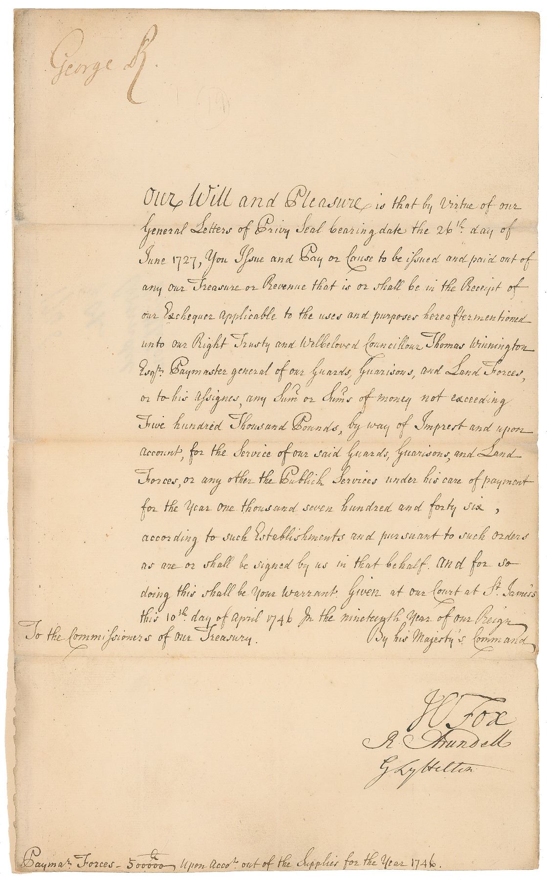 Manuscript DS, signed “George R.,” one page, 8.75 x 14.75, April 10, 1746. Official letter issued to the Commissioners of the Treasury, relating to the "Receipt of our Exchequer applicable to the uses and purposes hereafter mentioned unto our Right Trusty and Wellbeloved Councillor Thomas Winnington, Esqr., Paymaster general of our Guards, Guarisons, and Land Forces, or to his assignees, any Sum or Sums of money not exceeding Five hundred Thousand Pounds." Signed nicely in the upper left corner by King George II. In fine condition, with a strip of old tape along the back of the left edge.