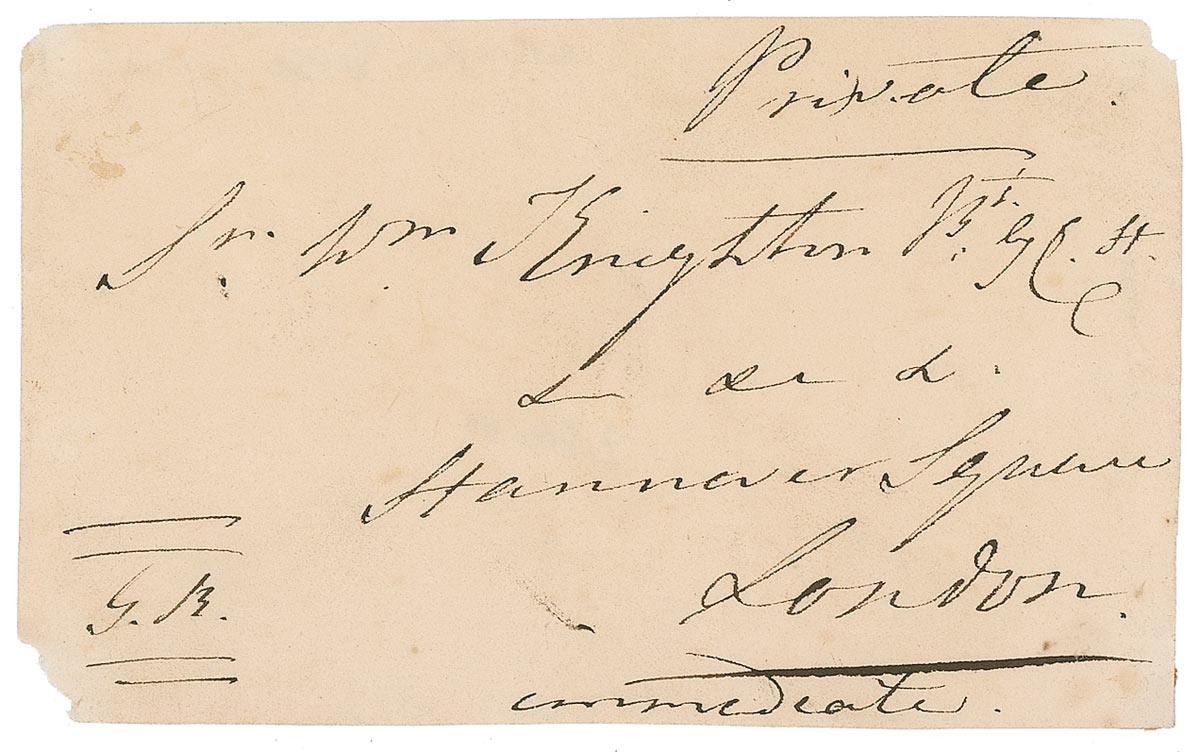 Envelope panel, signed “G.R,” one page, 4.75 x 3, no date, affixed to a slightly larger slip, addressed to “Sir Wm. Knighton” of London. Scattered soiling and toning, with missing corner tips at the lower left and upper right, otherwise fine condition.