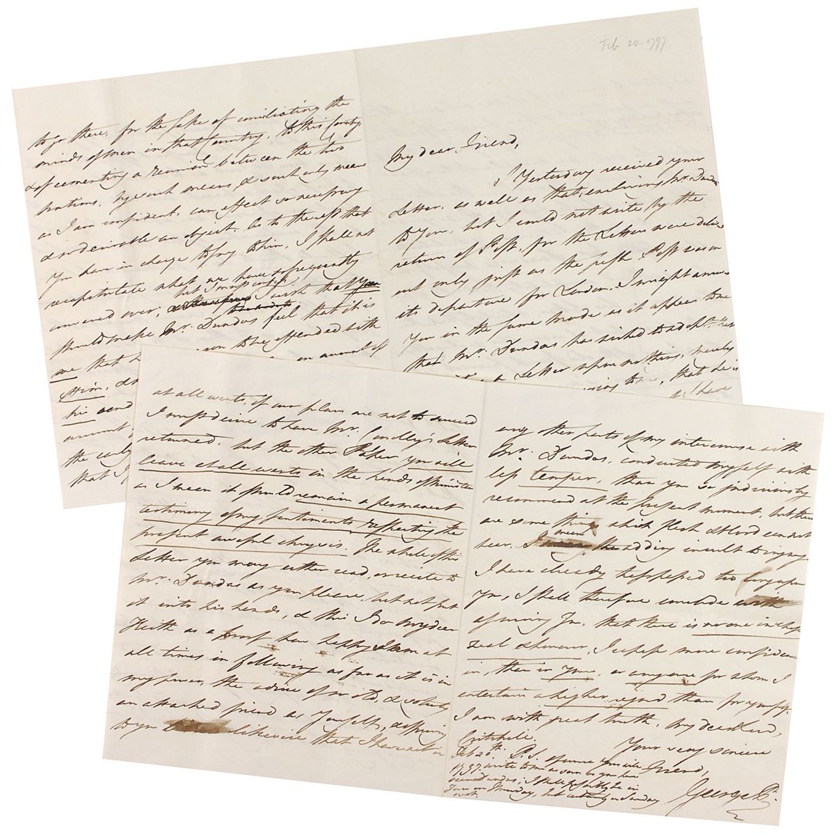 ALS signed “George R,” seven pages on two sets of adjoining sheets, 7 x 8.75, no date. Letter to Lord Keith. In part: “I might answer you in the same mode as it appears to me that Mr. Dundas has wished to adopt this writing a letter upon nothing, merely for the sake of conveying to me, that he is offended at the line of conduct I have adopted to him, as if it was not owing to that sniff impertinent & open breach offenth which so far from denying he appeared to glory in, to judge from the letter which he wrote me now almost two years back, which I showed you the other day, and of which no one can be so perfect a judge as you were present at the Interviews which took place between Mr. Dundas & myself, but I had…completely the drift of Mr. Dundas in his letter, which to strike the first blow…It occurs to me to come to the point as shortly as possible & to dismiss trifling circumstances for things of greater magnitude. The prospect of the mission you have been so good as to undertake, was not to keep open a heart, but to endeavor to heal one, if such was upon trial found to be the inclination of Mr. Dundas, & which I should think he in particular but like other ministers ought in every account to wish especially at such a serious moment as the present one is to them & to the whole nation pregnant with every merit of mischief, & ready to thrust over their heads. You were not to discuss merely the affairs of Ireland but many other topics with him; the affairs of Ireland merely as far as it was my wish to you there, for the sake of conciliating the minds of men in that country.” Accompanied by the original 8.75 x 7 mailing panel which retains its original red wax seal. In fine condition, with intersecting folds, one through a single letter of signature.