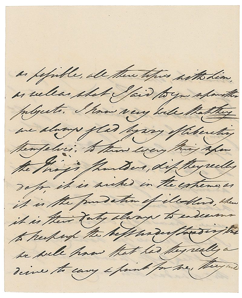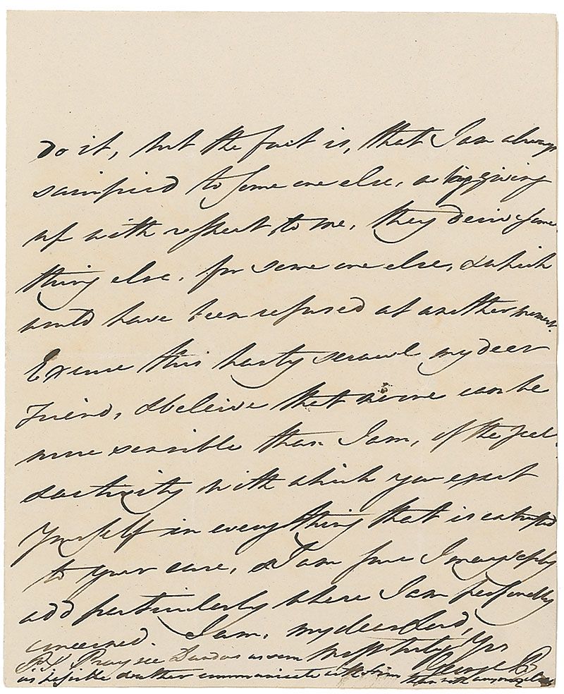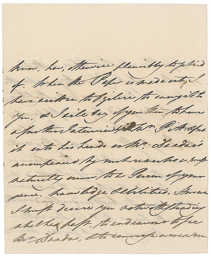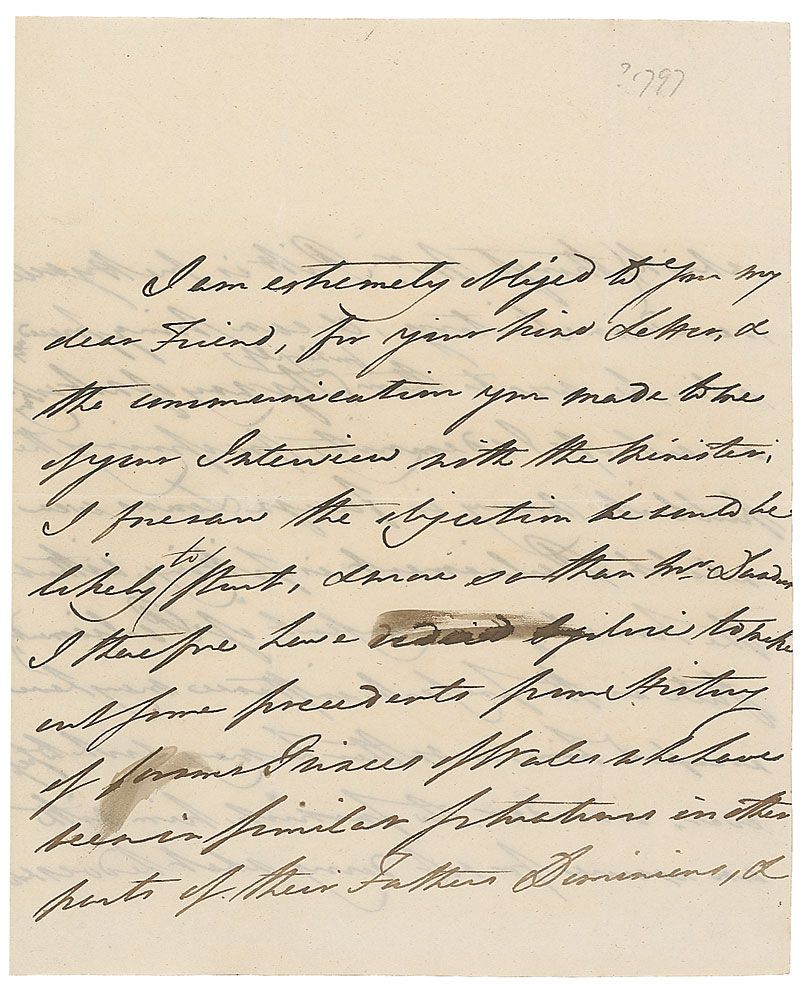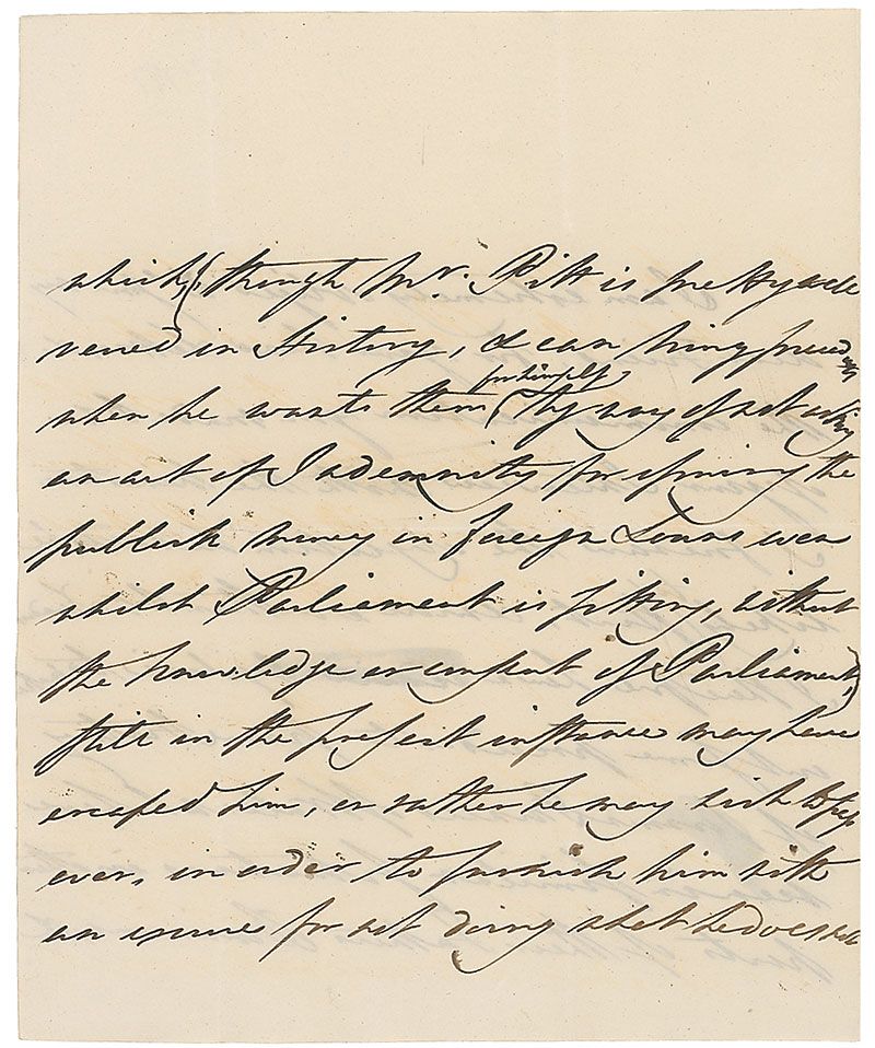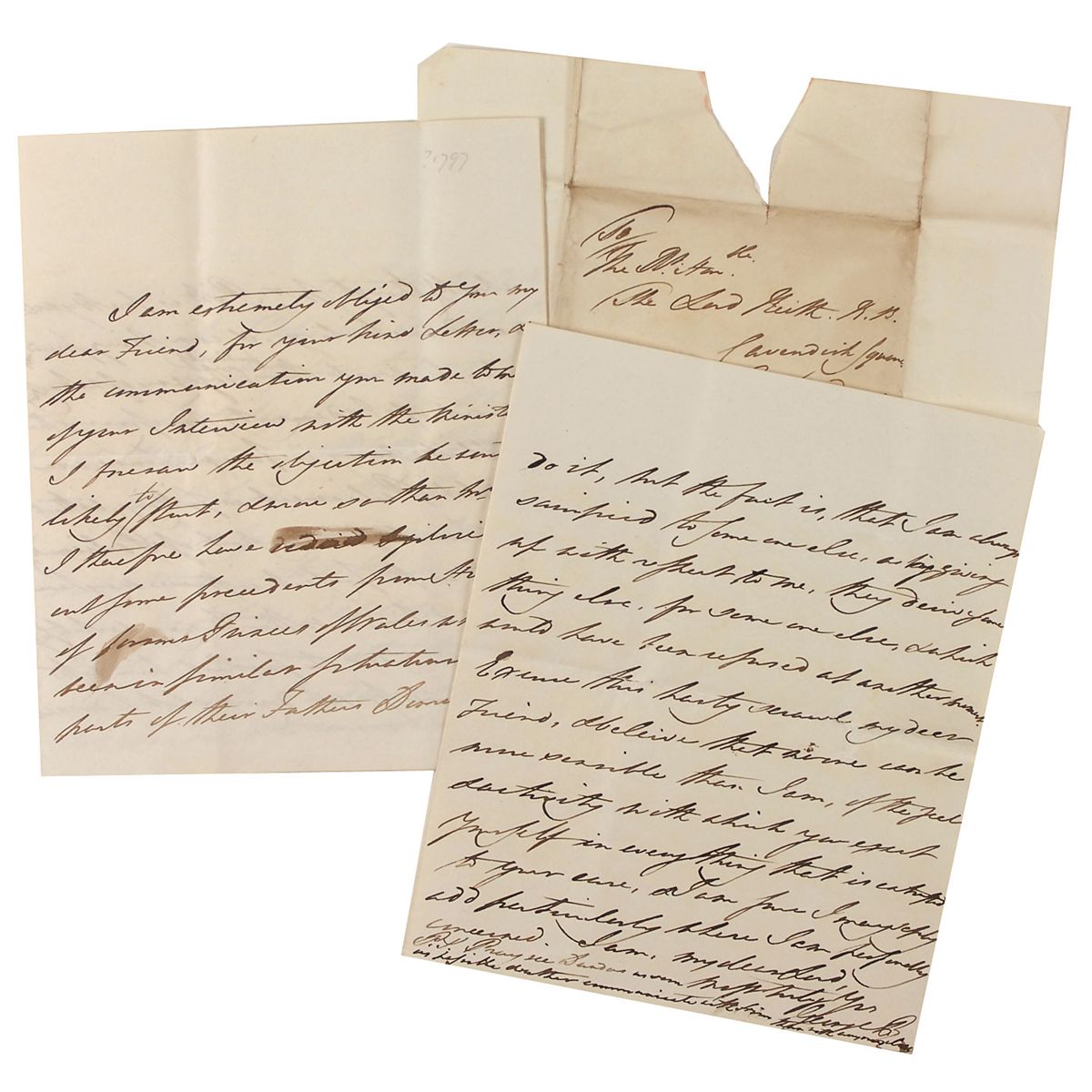 ALS signed “George R,” five pages on two sets of adjoining sheets, 7 x 9, no date but circa 1797. Letter to Lord Keith. In part: “I am extremely obliged to you my dear friend, for your kind letter, & the communication you made to me of your Interview with the Ministers; I foresaw the objection he sends…likely to part, & more so than Mr. Dundas…However I…desire you notwithstanding…To endeavor to see Mr. Dundas, & to conveye [sic] our concerns as possible, all these topics with him, as well as what I said to you upon other subjects. I know very well that they are always glad by way of liberating themselves; to know everything upon the King’s….” Also included is the 8.75 x 7 full mailing panel, addressed in George’s hand. In fine condition, with intersecting folds and some paper loss and soiling to address panel.