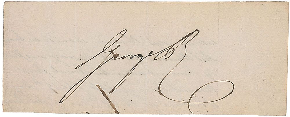 Large and bold ink signature, “George R,” on an off-white 7.75 x 3 slip clipped from a document. In fine condition, with a few vertical folds.