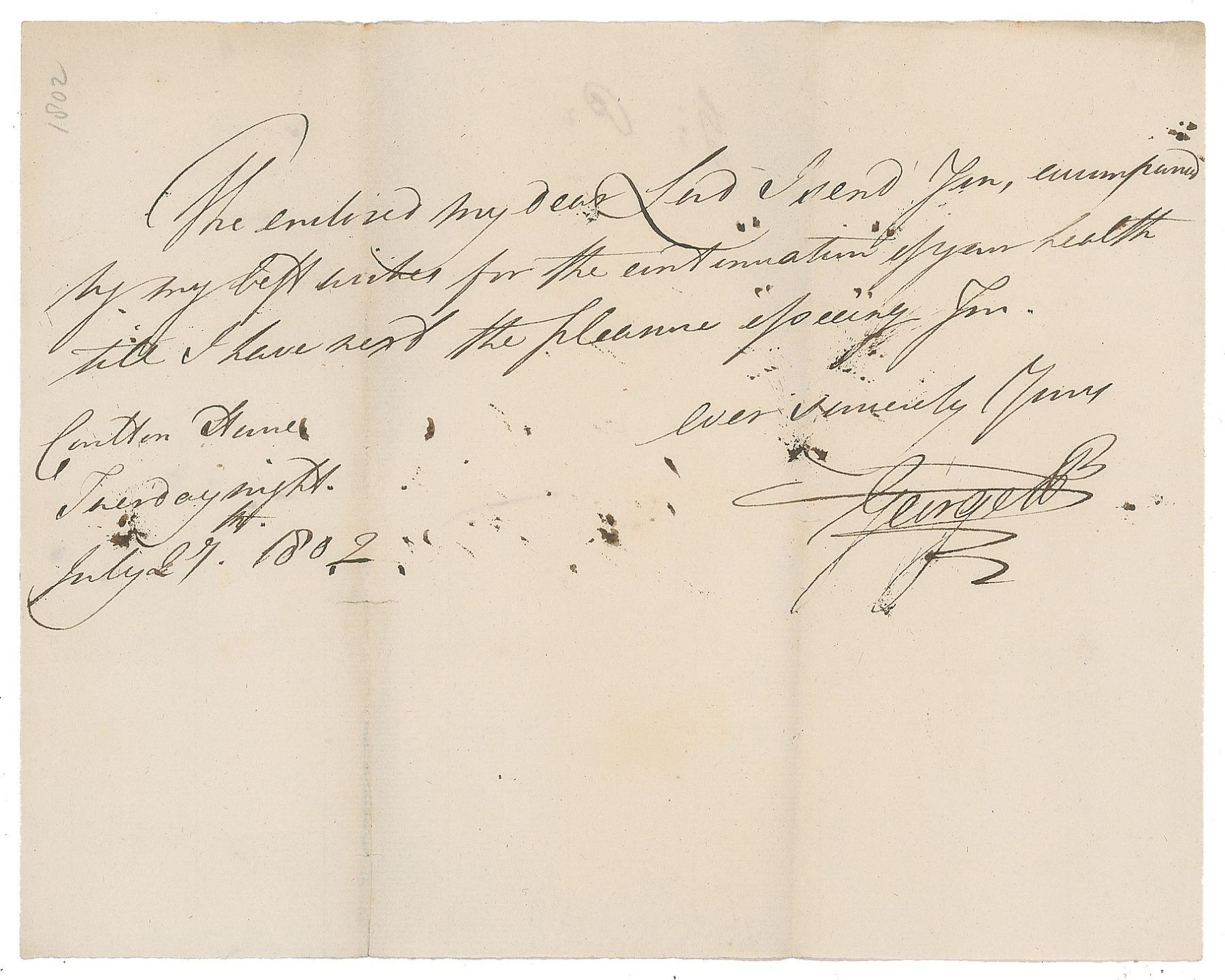 ALS signed “George P.,” one page, 9.25 x 7.25, July 27, 1802. In full: "The enclosed my dear Lord I send you, accompanied by my best wishes for the continuation of your health till I have next the pleasure 'of seeing' you." In fine condition.