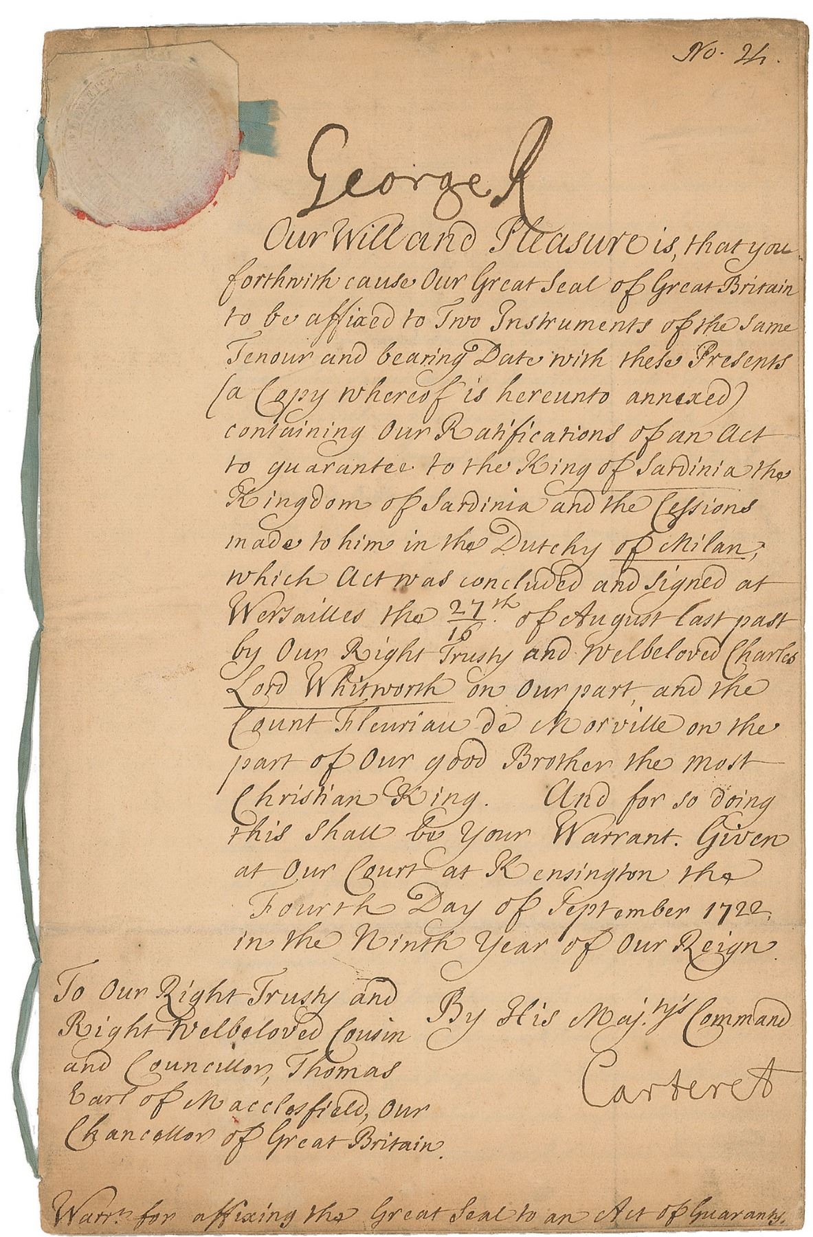 Historically significant manuscript DS, signed "George R," one page, 7.5 x 12, September 4, 1722. King George orders Thomas Earl of Macclesfield, Chancellor of Great Britain, to affix "Our Great Seal of Great Britain…Two Instruments of the same Tenour and bearing Date with these Presents (a Copy whereof is hereunto annexed) containing our Ratifications of an Act to guarantee to the King of Sardinia the Kingdom of Sardinia and the Cessions made to him in the Dutchy of Milan, which act was concluded and signed at the 27/16 of August last past by Our Right Trusty and Welbeloved Charles Lord Whitworth on Our part and the Count Fleurian de Morville on the part of Our good Brother the most Christian King." Boldly signed at the top by King George and countersigned at the conclusion by John Carteret as secretary of state. Bound to the document with its original ribbon is a three-page copy of the order, in Latin. The document retains its original seal affixed to the upper left. Intersecting folds and unobtrusive edge toning, otherwise fine condition.