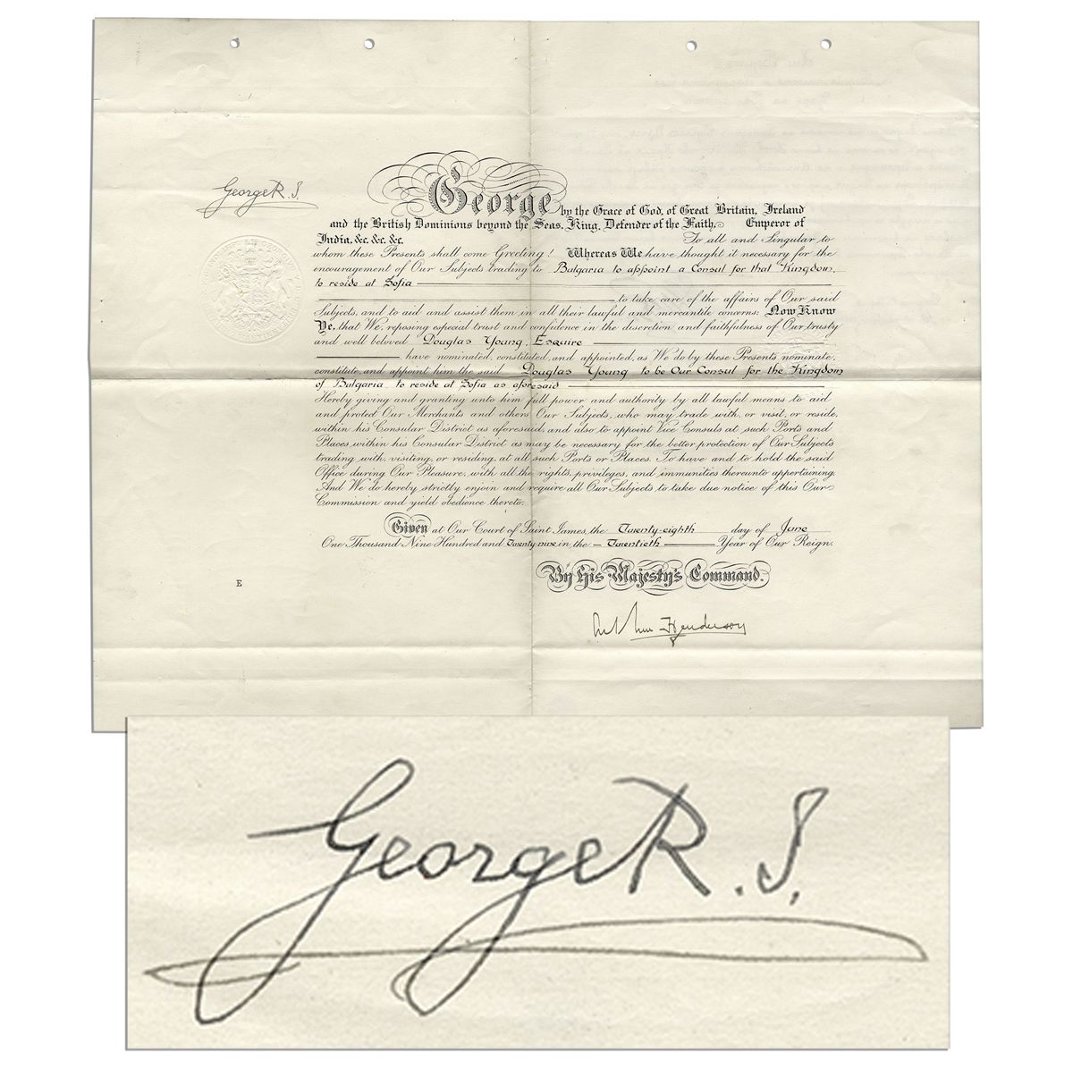 King George V document signed, ''George RI [Rex Imperator]'' as King of Great Britain and Emperor of India. Partially-printed document signed at upper left appoints one Douglas Young to the position of Consul for the Kingdom of Bulgaria. Appointment is dated 28 June 1929. Measures 21'' x 16.5''. Translation printed to verso, punch holes to edge and folds, else near fine.