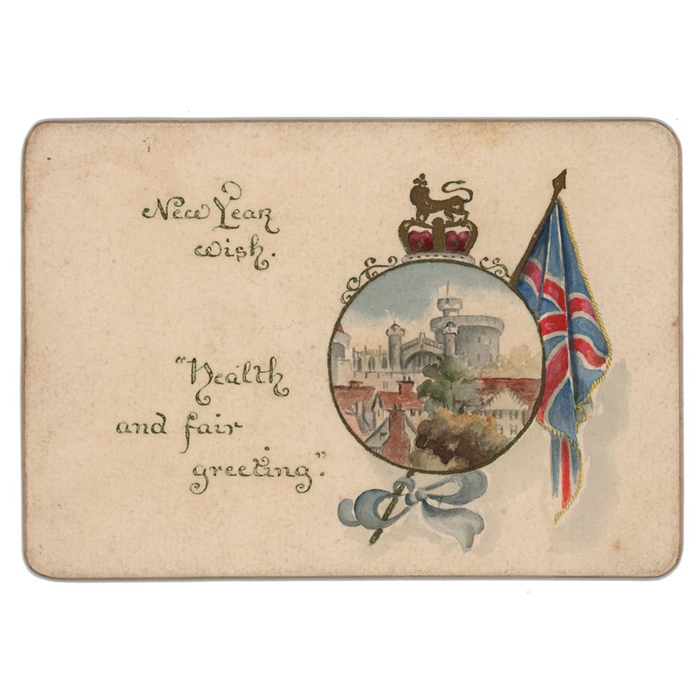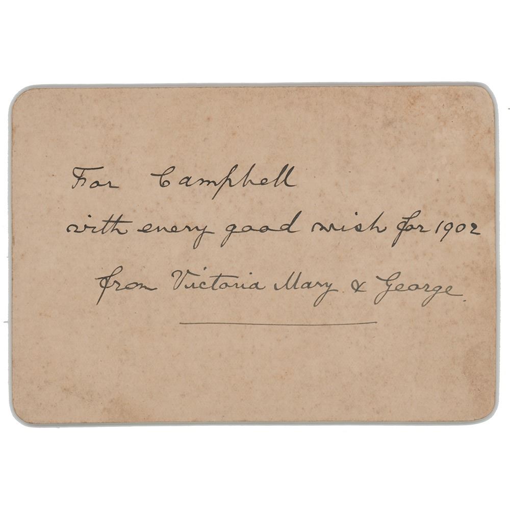Desirable hand-painted color 5 x 3.5 New Year's card, signed and inscribed on the reverse in ink by the future King George V on behalf of his wife and himself, "For Campbell, with every good wish for 1902, from Victoria Mary & George." In fine condition.