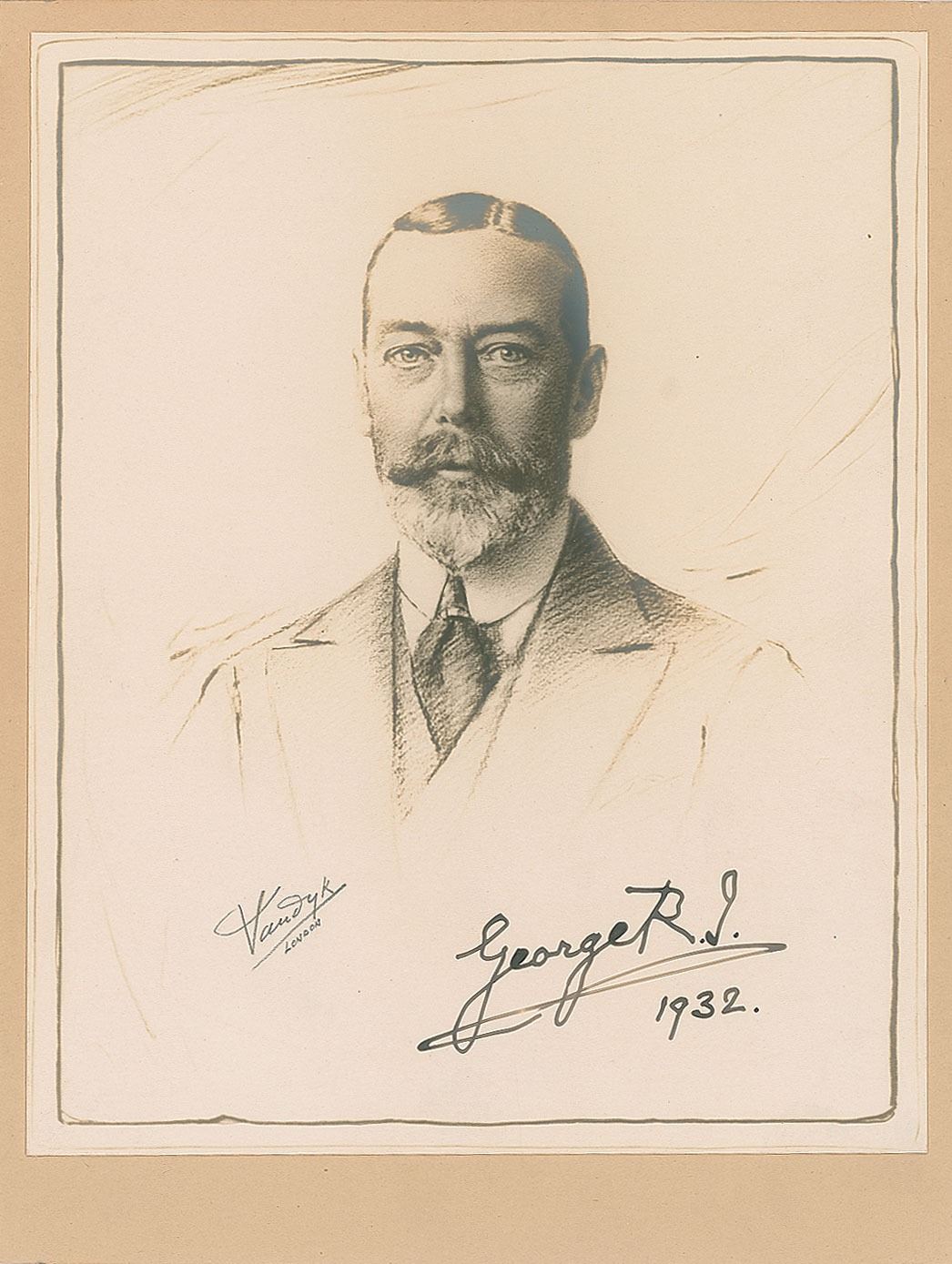 Vintage matte-finish 6 x 7.5 portrait of King George V by Vandyk of London, affixed to its original 6.5 x 8.5 mount, signed on the image in fountain pen, "George R.I., 1932." Reverse bears a Vandyk credit stamp. In fine condition.