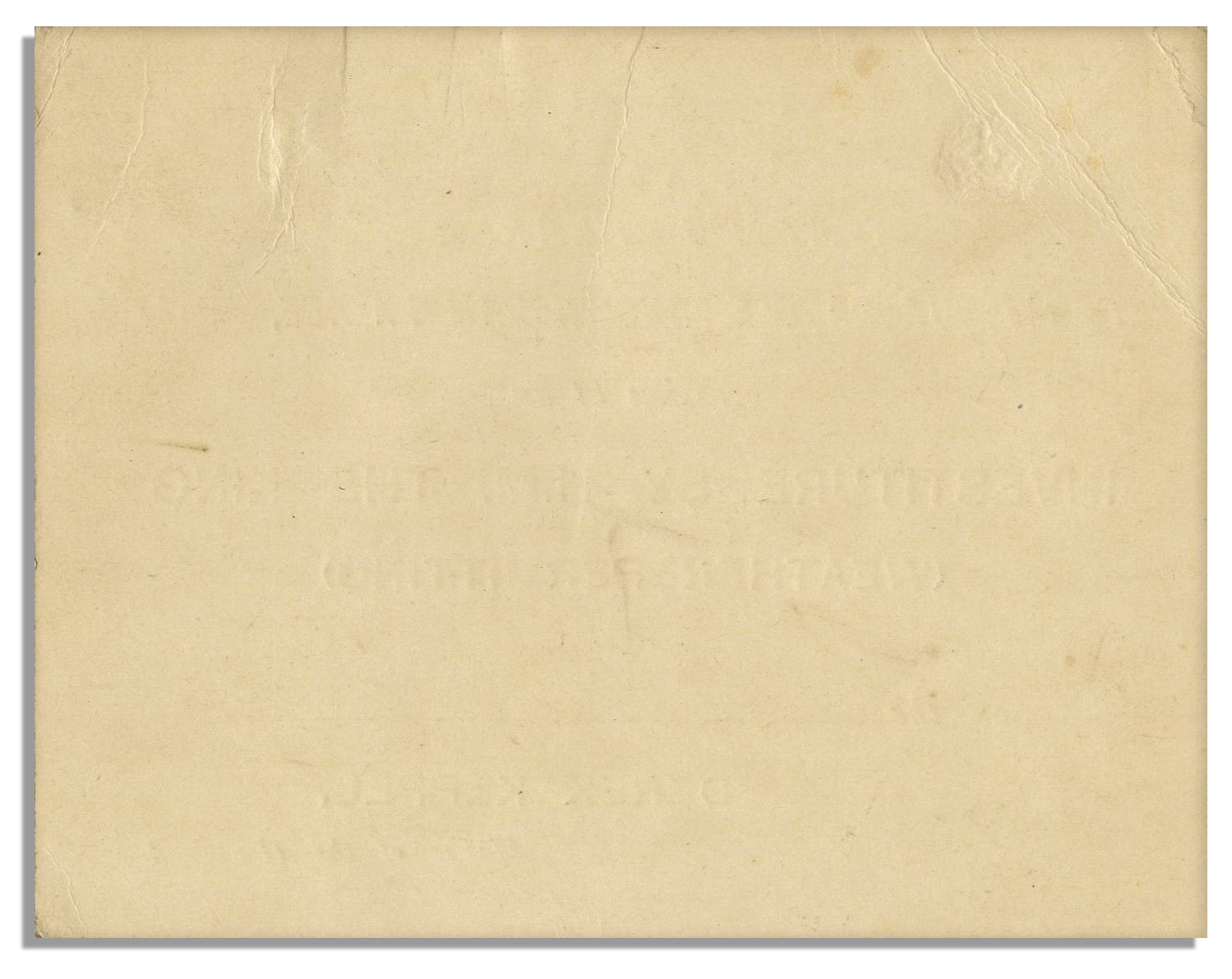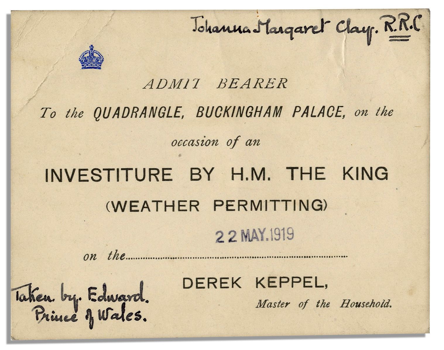 King George V official invitation to his Investiture (the bestowing of title), which took place on 22 May 1919. Ticket admits bearer to the quadrangle at Buckingham Palace, ''On the Occasion of an Investiture by H.M. The King''. Handwritten notes to ticket read, ''Johanna Margaret Clay / R.R.C.'' and ''Taken by Edward / Prince of Wales''. Invitation measures 4.75'' x 3.75''. Minor toning and a crease to top left. Very good.