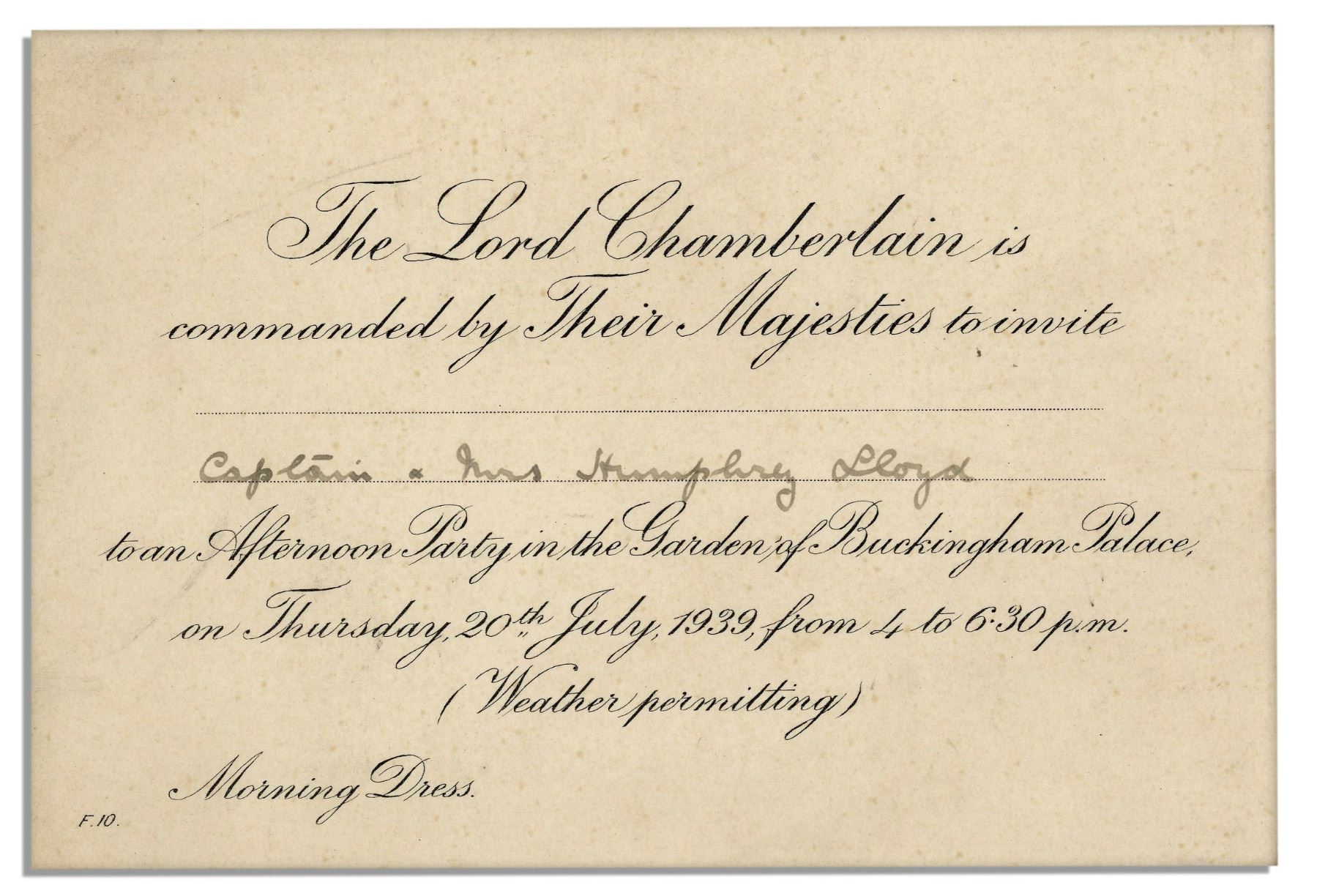Royal invitation to ''an Afternoon Party in the Garden of Buckingham Palace'' on 20 July 1939. Invitation sent by Lord Chamberlain on behalf of Their Majesties King George VI and Queen Elizabeth specifies the party will be held weather permitting and that attire is ''Morning Dress''. Partially-printed invitation is addressed by hand in ink to Captain & Mrs. Humphrey Lloyd. Measures 7.25'' x 5''. Light foxing and toning, else near fine.