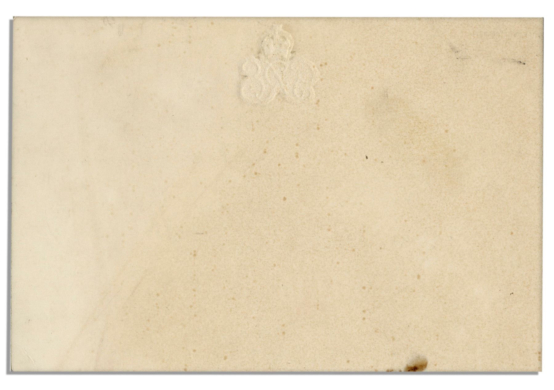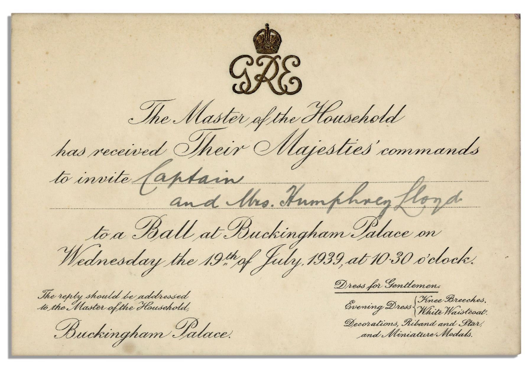 Royal invitation to ''a Ball at Buckingham Palace'' on 19 July 1939. Invitation sent by Lord Chamberlain on behalf of Their Majesties King George VI and Queen Elizabeth specifies the attire as ''Evening Dress: Knee Breeches, White Waistcoat / Decorations, Riband and Star / and Miniature Medals.'' Partially-printed invitation is addressed by hand in ink to Captain & Mrs. Humphrey Lloyd. With the royal cypher of George and Elizabeth in gilt at top. Measures 7.25'' x 5''. Foxing and a small stain to bottom edge, else near fine.