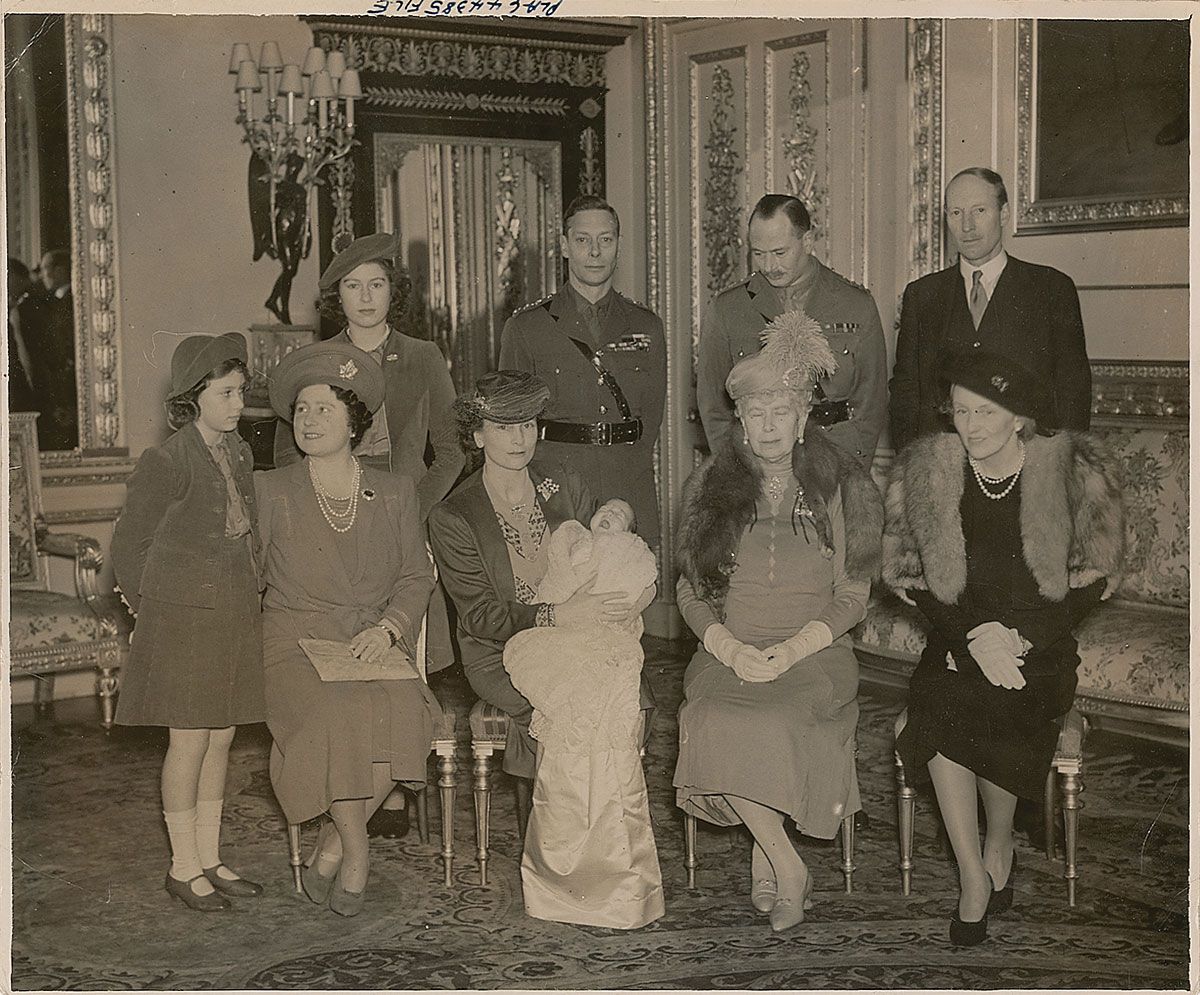 Original vintage 11.5 x 9.75 press photo of George VI and the Royal Family taken at the christening of Prince William of Gloucester. Reverse bears an informational caption and two Planet News Ltd stamps, as well as two crossed out censor stamps. Scattered light surface marks and creases and file notations to top border, otherwise fine condition.