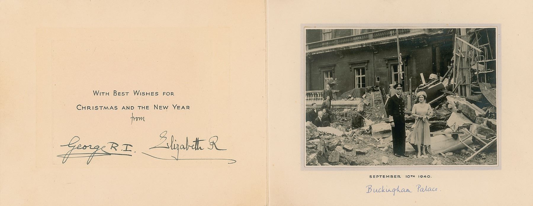 Christmas card from 1940 gilt-embossed with a crown on the front, measuring 15 x 6 open, with inside featuring an affixed image of the blitzed ruins of the Royal Chapel at Buckingham Palace, signed on the adjacent page in fountain pen, "George R.I." and "from Elizabeth R." In fine condition, with light soiling to the front cover.