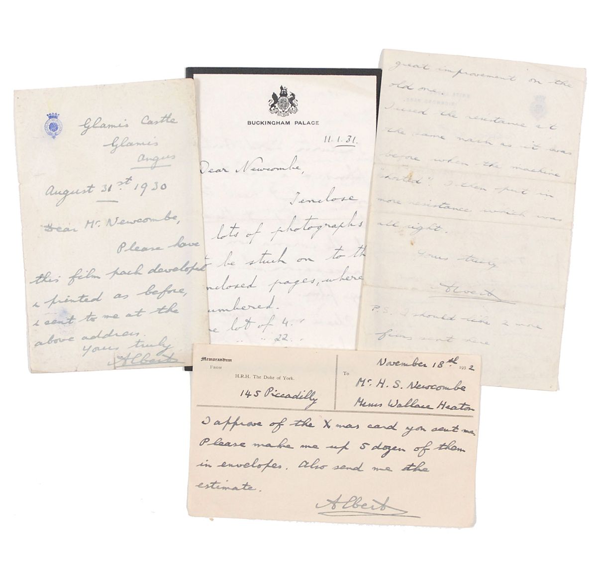 Four ALSs, three signed by King George VI as “Albert,” and one by his brother Prince Henry, Duke of Gloucester, signed “Henry,” all written to photographer Henry Sainsbury Newcombe, dated between 1925 and 1932. The letters contain general photographic content, including requests for prints and enlargements, and sending film to be developed. In overall very good to fine condition. Accompanied by one original mailing envelope addressed in George VI’s hand, as well as two small photographs. Newcombe was a prominent member of the Royal Photographic Society and advised George VI on photographic matters. An intriguing selection of letters concerning George’s photographic hobby.