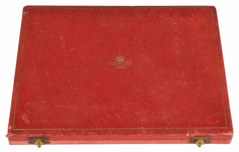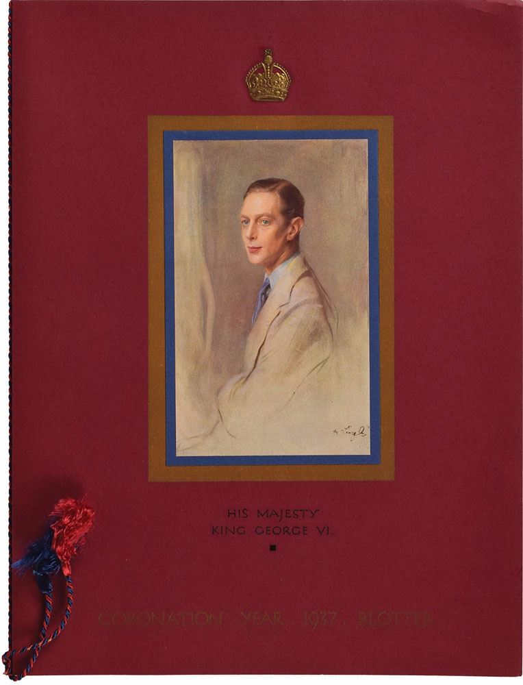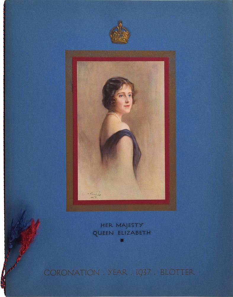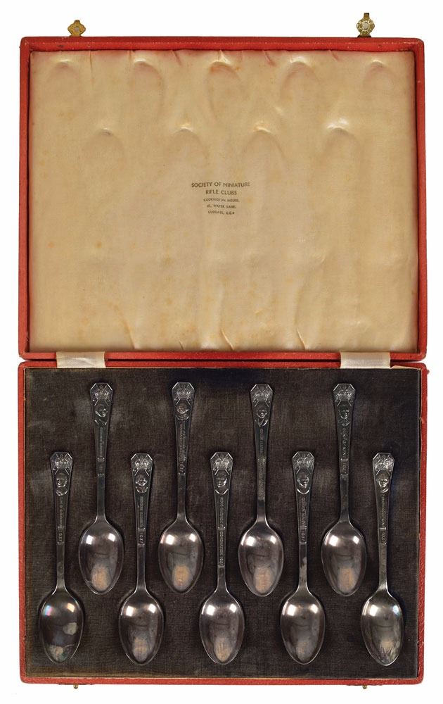Handsome cased set of nine spoons commemorating the coronation of King George VI in 1937, each measuring 5.5? long, each depicting a member of the royal family: King George VI, Queen Elizabeth, Queen Mary, Duke of Kent, Duchess of Kent, Princess Margaret Rose, Princess Elizabeth, Duchess of Gloucester, and Duke of Gloucester. The back of each spoon is marked, "Bravingtons E.P.N.S." The case is stamped on the top with a crown and "Coronation 1937," and the inside is marked, "Society of Miniature Rifle Clubs." Also includes official 1937 souvenir coronation blotters honoring King George VI and Queen Elizabeth. In fine condition, with wear and rubbing to the presentation case.
