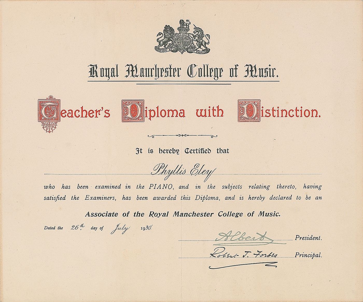 Partly-printed DS, signed “Albert,” one page, 13 x 10.75, July 26, 1930. A "Teacher's Diploma with Distinction" issued by the Royal Manchester College of Music, declaring Phyllis Eley, having studied piano, to be "an Associate of the Royal Manchester College of Music." Signed at the conclusion by Prince Albert (the future King George VI) and countersigned by Robert T. Forbes. In fine condition, with a central vertical fold.
