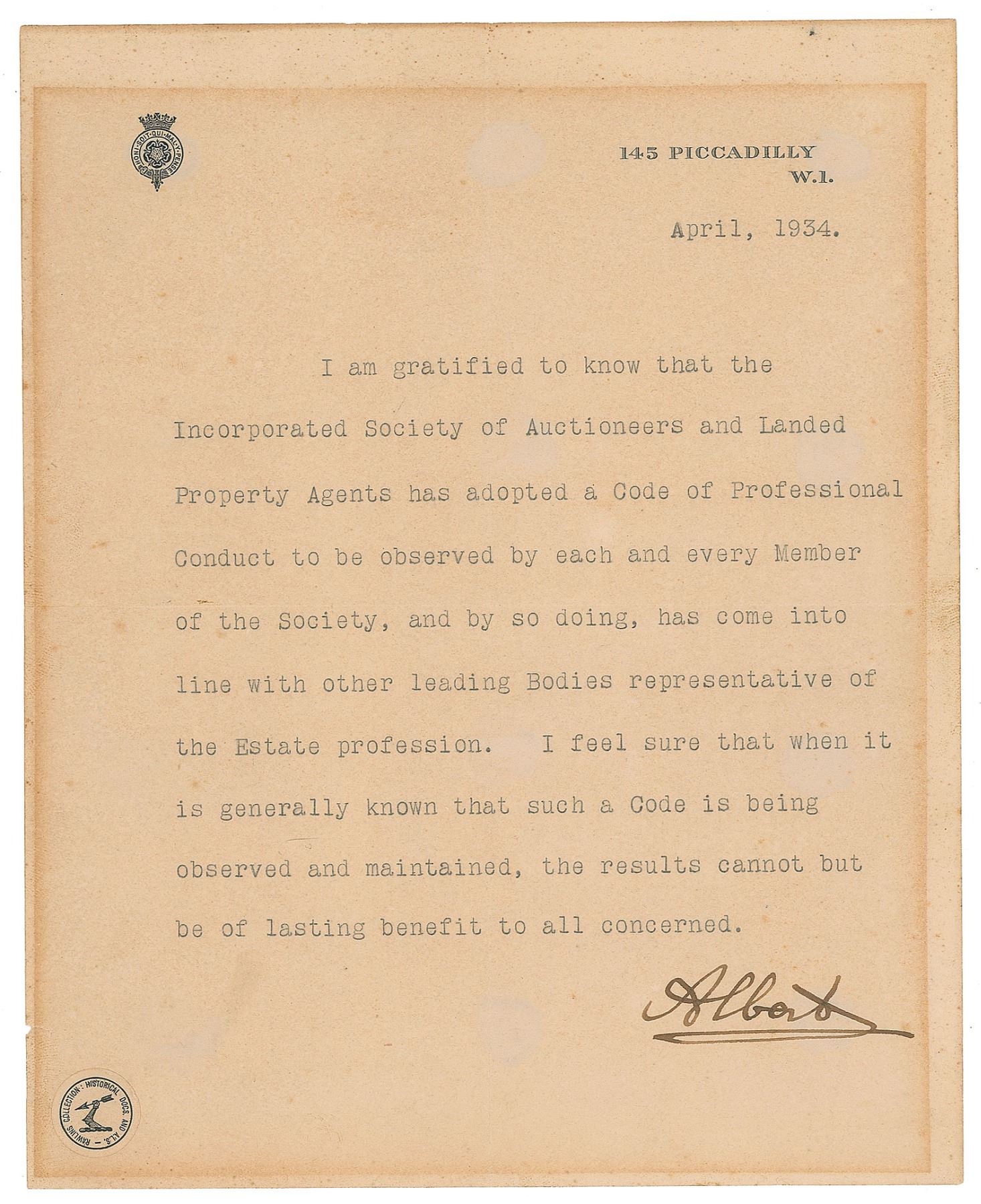 TLS as the Duke of York, signed “Albert,” one page, 8 x 10, 145 Piccadilly W1 letterhead, April 1934. In full: "I am gratified to know that the Incorporated Society of Auctioneers and Landed Property Agents has adopted a Code of Professional Conduct to be observed by each and every Member of the Society, and by so doing, has come into line with other leading Bodies representative of the Estate profession. I feel sure that when it is generally known that such a Code is being observed and maintained, the results cannot but be of lasting benefit to all concerned." In very good to fine condition, with scattered light foxing, and toning from prior display.