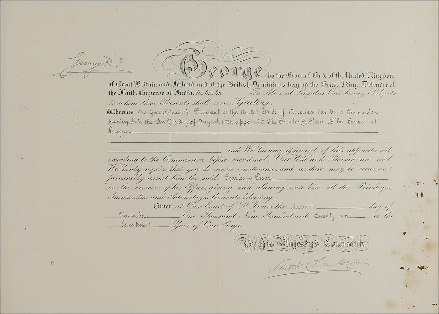 King of Great Britain and Northern Ireland (1865–1936) who reigned from 1910 until his death. Partly-printed DS, signed “George R. I.,” one page, 18.25 x 13.25, November 16, 1926. George approves the appointment by “our good friend the President of the United States of America has be a Commission bearing date the Twelfth day of August, 1926, appointed Mr. Charles J. Pisar to be Consul at Rangoon…We having approved this appointment.” Signed in the top left by George. Central vertical and horizontal fold, some mild toning, and some heavier toning and foxing to lower right, otherwise fine condition.