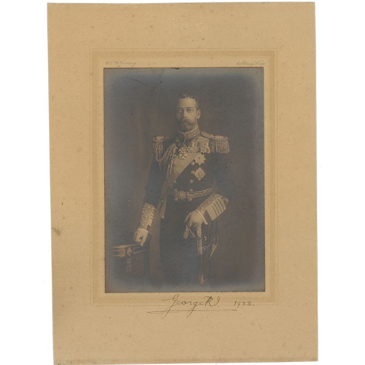 King of Great Britain and Northern Ireland (1865–1936) who reigned from 1910 until his death. Vintage matte-finish 4 x 5.5 photo of George in formal military dress by W & D Downey, and affixed to its original 6.75 x 9 mount, signed in fountain pen on the mount, “George R. I. 1923.” In very good condition, with silvering to edges and darker parts of image, and uniform light toning and scattered light foxing to mount.