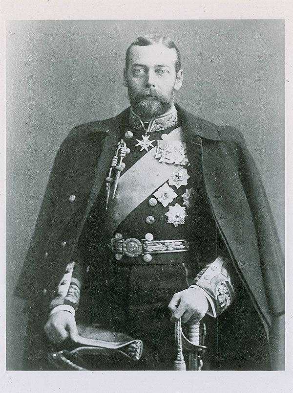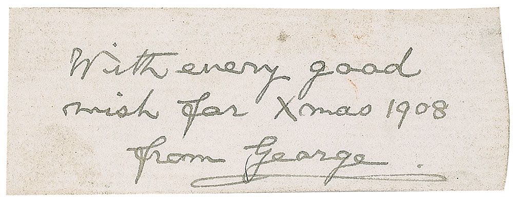 King of Great Britain and Northern Ireland (1865–1936) who reigned from 1910 until his death. Ink signature, “With every good wish for Xmas 1908, from George,” on an off-white 2.5 x 1 slip affixed to a slightly larger card. Light scattered soiling, otherwise fine condition.