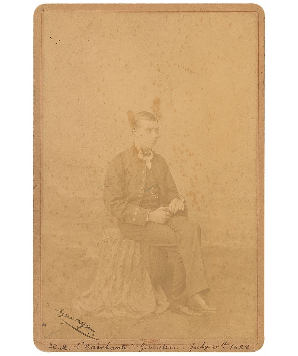 King of Great Britain and Northern Ireland (1865–1936) who reigned from 1910 until his death. Original 4.5 x 6.5 cabinet photo of George as a young man, signed at the bottom of the image in black ink, “George.” Collector’s notation to the lower border dates the photo to 1882, which would make George 17 years old. Moderate overall foxing and toning, and the image a bit faded, otherwise very good condition.