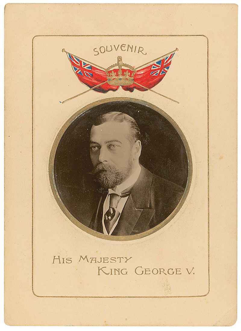 King of Great Britain and Northern Ireland (1865–1936) who reigned from 1910 until his death. All-British Series souvenir photo postcard, 3.5 x 5, bearing a 2? diameter circular portrait of George V in the center. Reverse has a bendable and removable strut affixed to the reverse. In fine condition, with light surface marks to image and some scattered light creases and toning to edges.