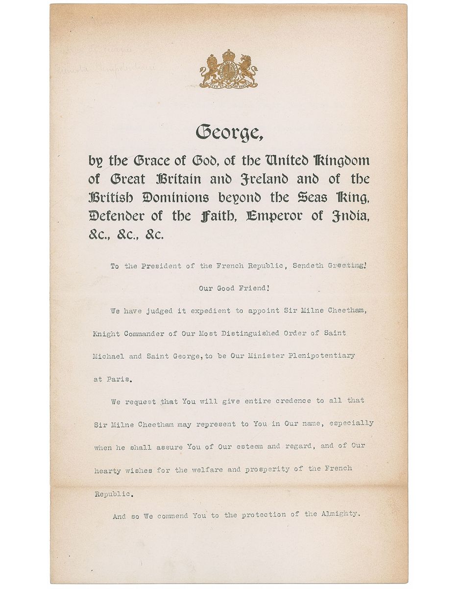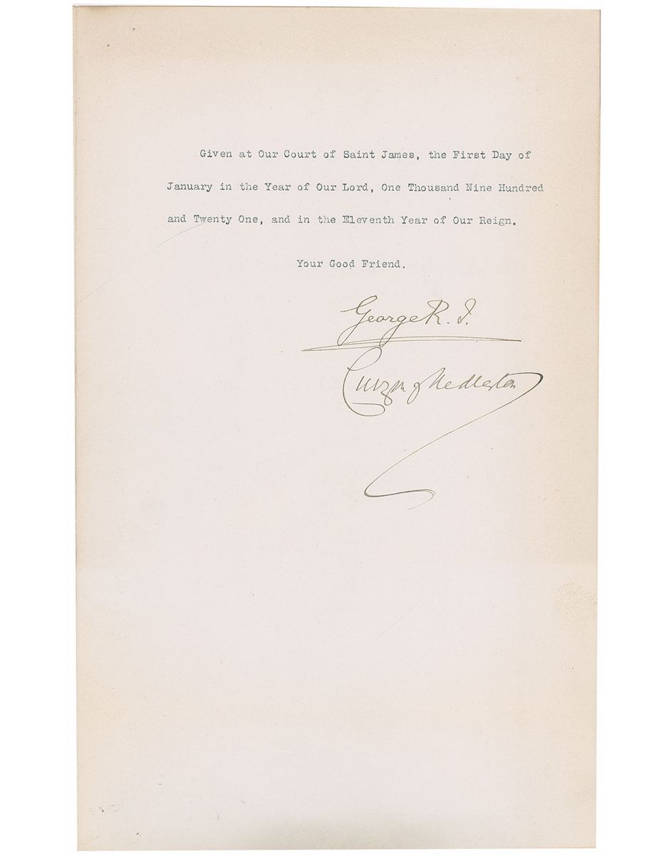 DS, signed “George R. J.,” two pages on two adjoining sheets, 8 x 13, January 1, 1921. A letter of state to the president of France. In part: “We have judged it expedient to appoint Sir Milne Cheetham, Knight Commander of Our Most Distinguished Order of Saint Michael and Saint George, to be Our Minister Plenipotentiary at Paris…he shall assure You of Our esteem and regard, and of Our hearty wishes for the welfare and prosperity of the French Republic.” Signed at the conclusion by King George and countersigned by George Curzon. In fine condition, with moderate toning to edges. Accompanied by the original transmittal envelope.