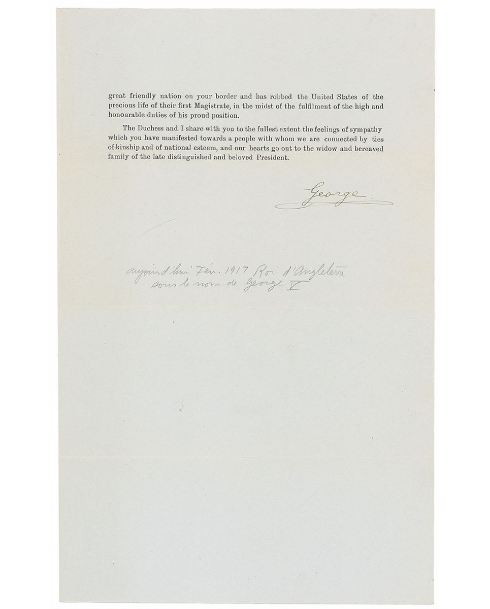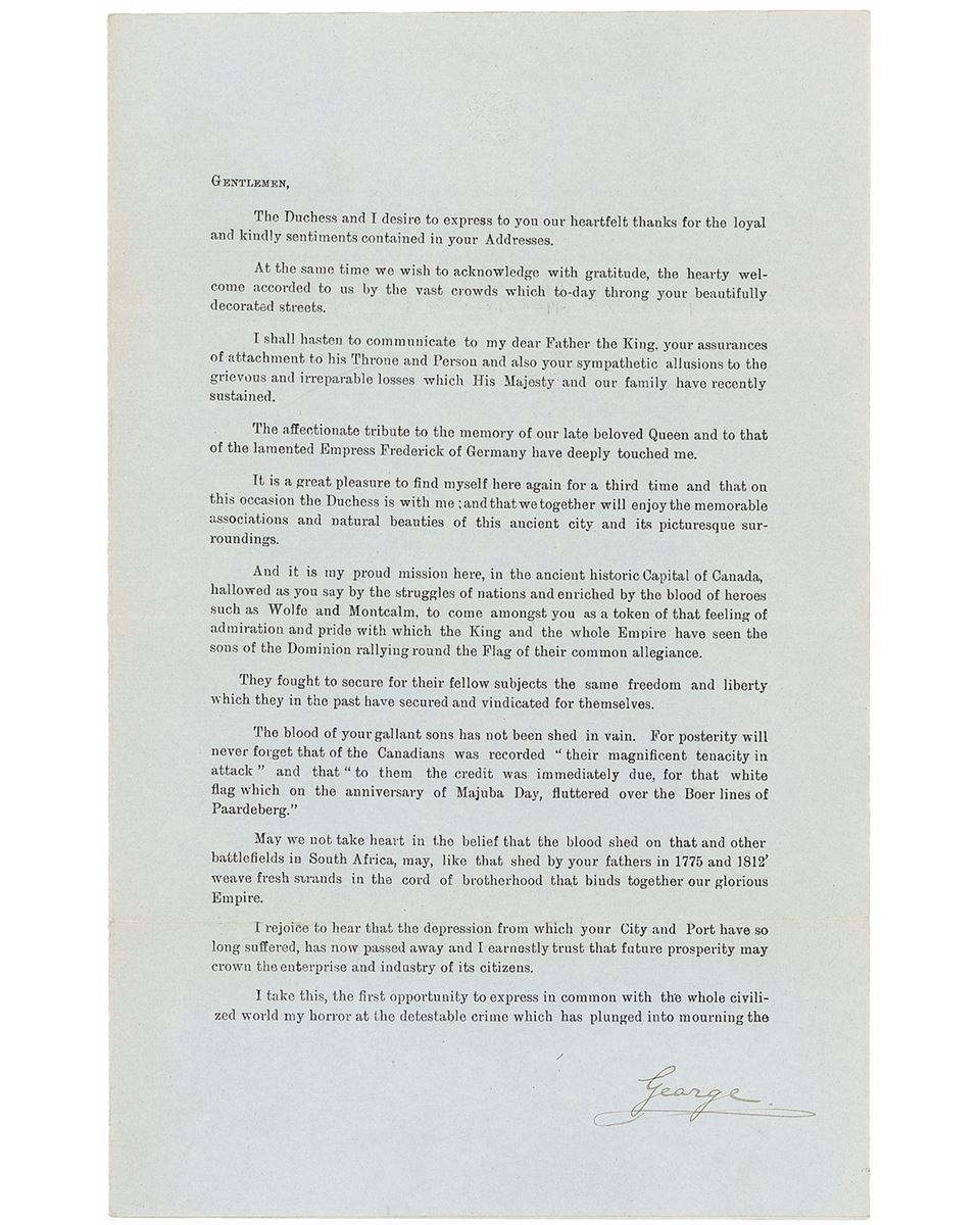 Printed DS, signed twice, “George,” two pages on two adjoining sheets, 8.25 x 13, no date but circa September 1901. A printed copy of an address made in Canada during his tour of the British Empire, pertaining to the fallen Canadian soldiers at Majubamountain in South Africa that effectively ended the first Boer War. In part: “It is a great pleasure to find myself here again for a third time and that on this occasion the Duchess is with me; and that we together will enjoy the memorable associations and natural beauties of this ancient city and its picturesque surroundings. And it is my proud mission here, in the ancient historic Capital of Canada, hallowed as you say by the struggles of nations and enriched by the blood of heroes such as Wolfe and Montcalm, to come amongst you as a token of that feeling of admiration and pride with which the King and the whole Empire have seen the sons of the Dominion rallying round the Flag of their common allegiance.” Nicely signed at the conclusion of each page by George. In fine condition. Accompanied by three letters in French related to the visit.