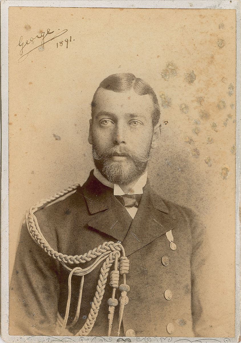 Appealing 4.25 x 5.75 cabinet photo of a young George V in a half-length pose wearing his Royal Navy uniform, signed in the upper left corner in black ink, “George, 1891.” Published by Livernois Photography of Quebec. In very good condition, with evidently trimmed borders, some small surface gouges, and scattered water spots affecting appearance.