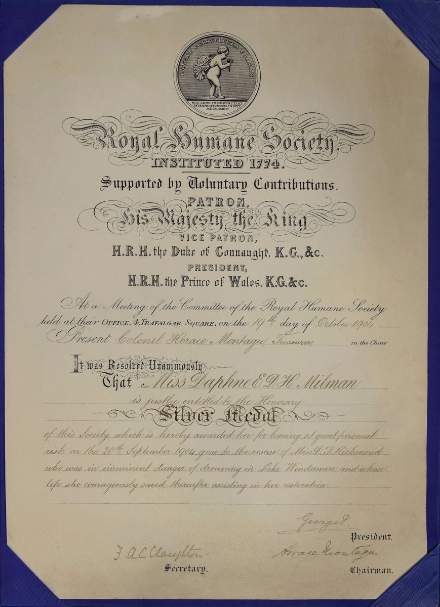Partly-printed DS, signed “George R.,” one page, 9.75 x 13.75, October 19, 1904. Certificate from the Royal Humane Society, in part: "It was Resolved Unanimously that Miss Daphne E. D. H. Milman is justly entitled to the Honorary Silver Medal of this Society, which is hereby awarded her for having at great personal risk on the 20th September 1904 gone to the rescue of Miss D. F. Richmond who was in imminent danger of drowning in Lake Windermere and whose life she courageously saved, thereafter assisting in her restoration." Signed at the conclusion as society president by George. Housed in its original Royal Human Society presentation folder. In fine condition, with light overall soiling.