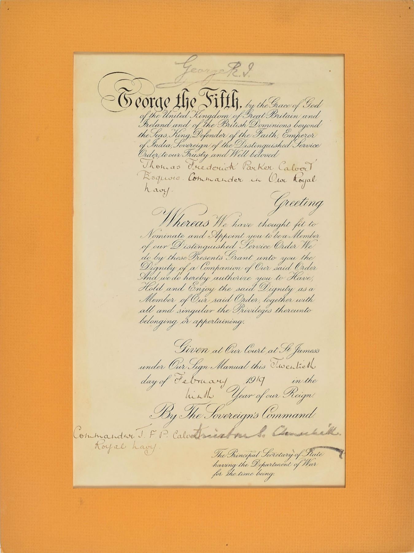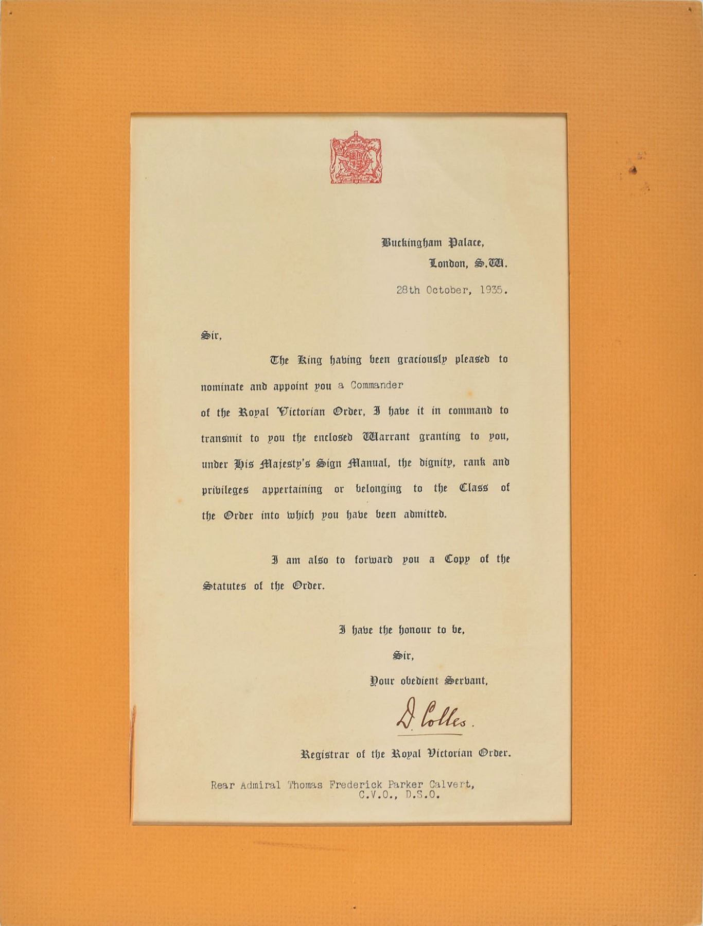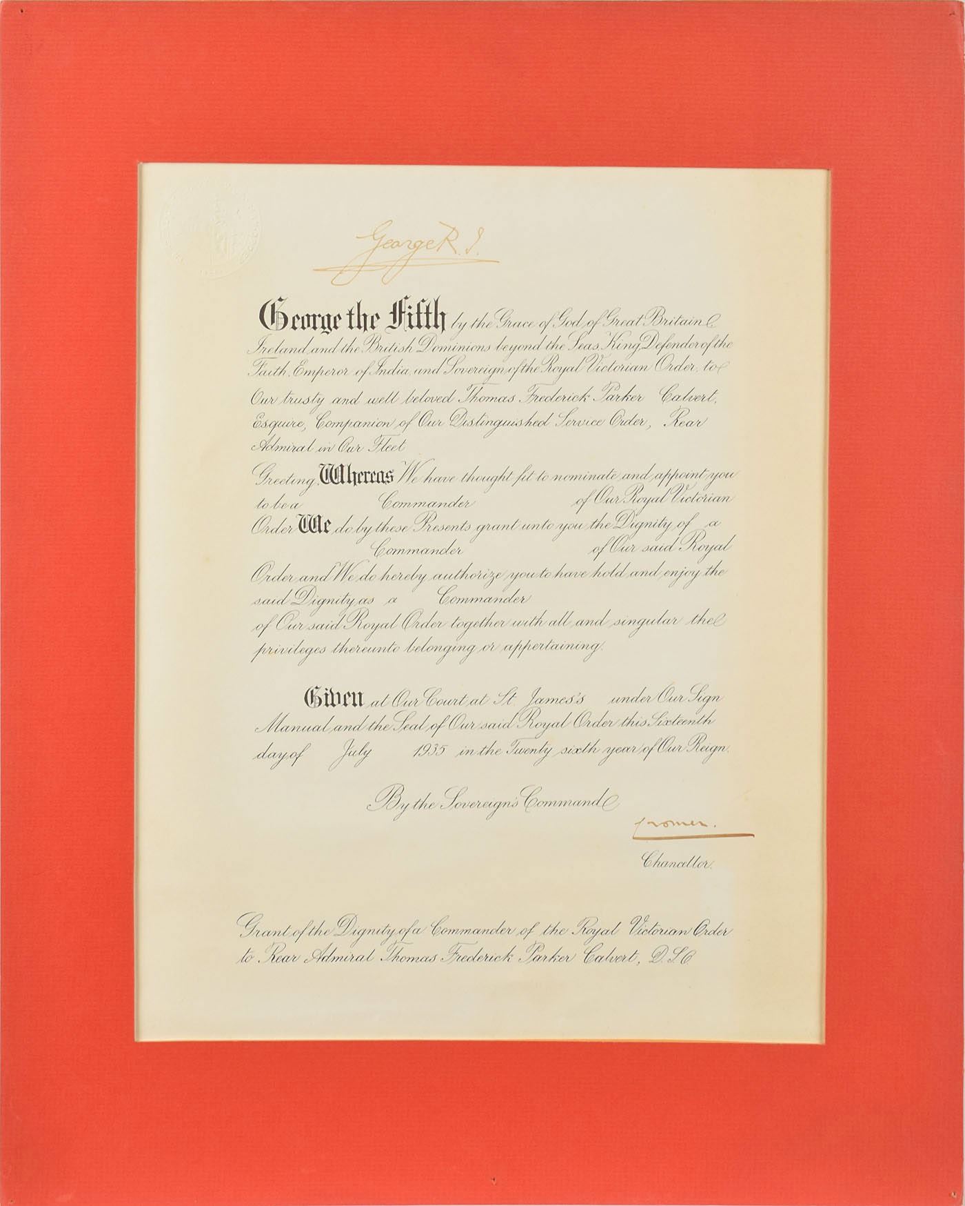 Partly-printed DS, signed “George R. I.,” one page, 11.5 x 14.5, July 16, 1935. King George appoints Thomas Frederick Parker Calvert as "Commander of Our Royal Victorian Order." Signed along the top by the king. Matted to a slightly larger size. In fine condition, with some light toning to the right edge. Accompanied by a 1919 appointment for Calvert bearing stamped signatures of King George V and Winston S. Churchill; a 1936 appointment for Calvert bearing a stamped signature of King Edward VIII; and a 1935 letter to Calvert from the registrar of the Royal Victorian Order. Also includes an official coronation program for King George V, and a colorful 6 x 7.25 silk depicting George V on horseback.