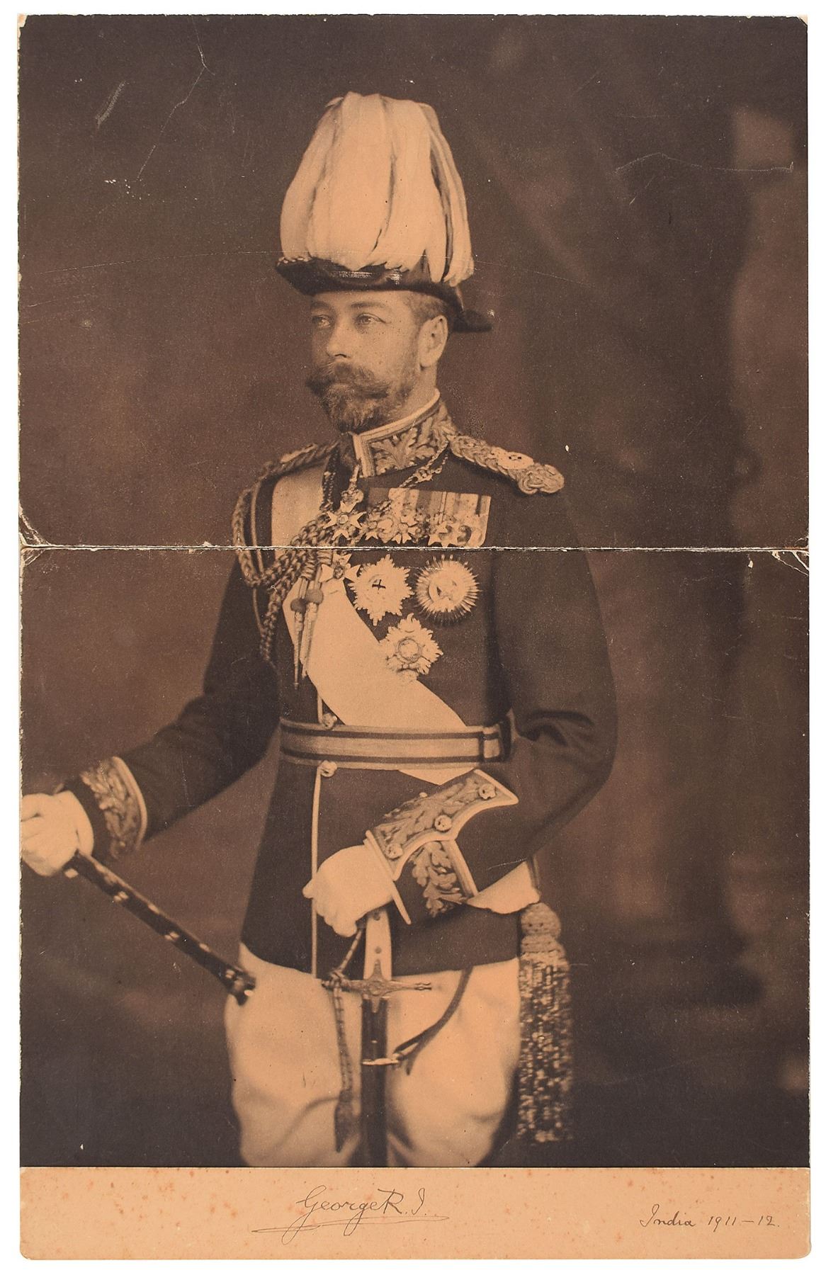 Vintage matte-finish 12.25 x 19.25 photo of King George wearing his military attire in a distinguished three-quarter-length pose, signed on a card affixed to the lower border in fountain pen, "George R. I., India 1911–12." In very good condition, with light foxing to the lower border, some light scratches to the background, and complete horizontal separation reinforced with tape on the reverse. On December 12, 1911, King George and Queen Mary traveled to India for the Delhi Durbar, where they were presented to an assembled audience of Indian dignitaries and princes as the Emperor and Empress of India.