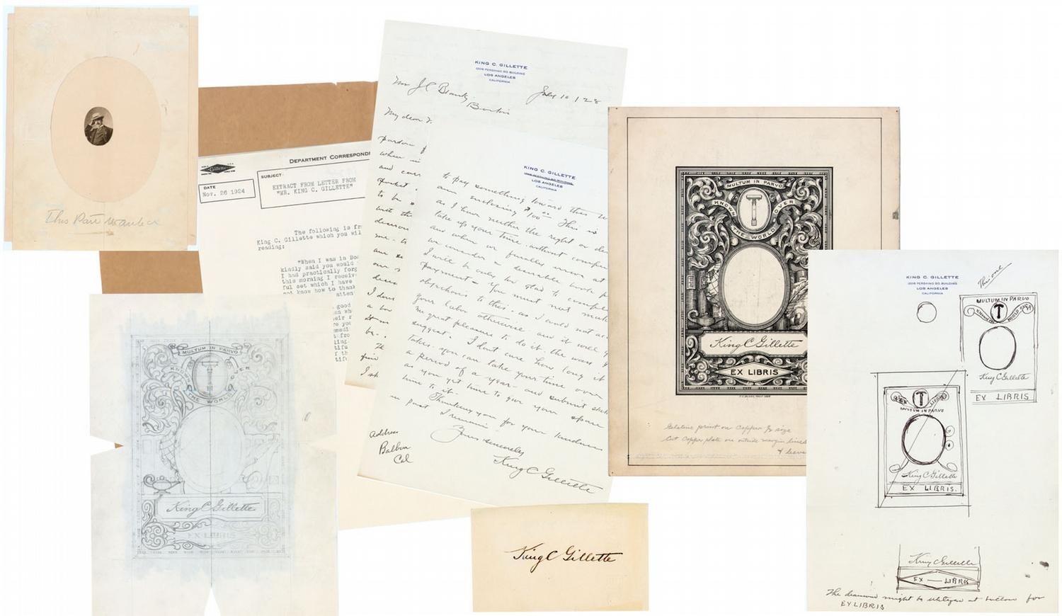 KING GILLETTE (1855 - 1932). Inventor of the safety razor, founder of Gillette. A fine group of 8 items related to the design of King Gillette’s bookplates for his personal library. A detailed ALS demonstrates the personal attention to detail and pride taken by the razor magnate in the development of his bookplate. Gillette writes a lengthy 3 page letter in which he provides explicit detail as to design features for his bookplate, in part; “I have tried to make a rough sketch showing the razor - as you have shown it - with an idea of what I would lie in the way of lettering Multuim in Parvo (much in little) above razor in a straight line. The razor on a clean background and made to be clear and distinct 0 scroll under razor oval - to contain “KNOWN THE WORLD OVERS’ - Then comes oval for trade mark picture and then my name in script - then across bottom in a panel EX LIBRIS - filling in to be scroll work…” Accompanying the letter are two pages of drawings, one completely in Gillette’s hand which he has signed three times in the drawings, and another being the artists proof or rendition. Additionally, there is a litho proof, a couple of accompanying letters concerning the bookplates by Gillette’s assistant and a very tiny photo of Gillette. A highly unusual group and related to this man whose autograph is seldom encountered.