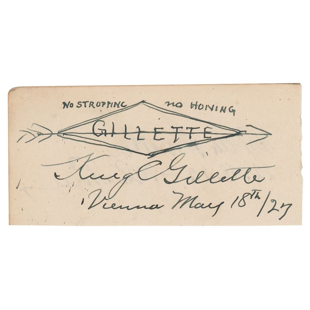 Rare original vintage fountain pen sketch of the Gillette razor logo accomplished by company founder King Gillette on an off-white 4.75 x 2.25 slip, signed below, "King C. Gillette, Vienna, May 18th/27." In fine condition.