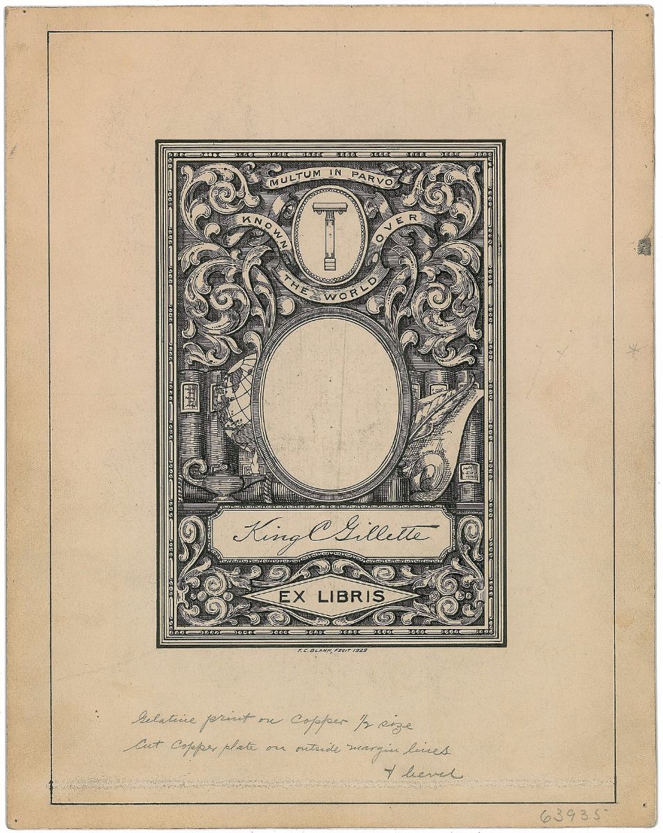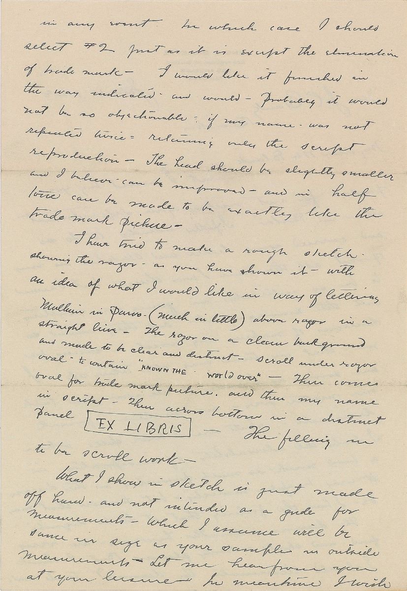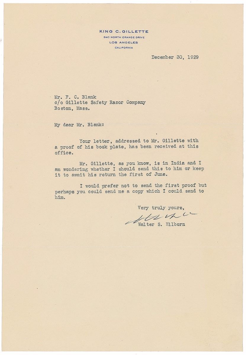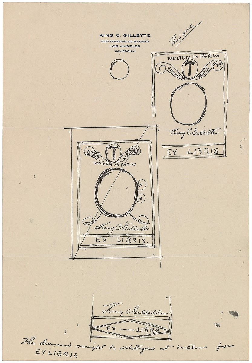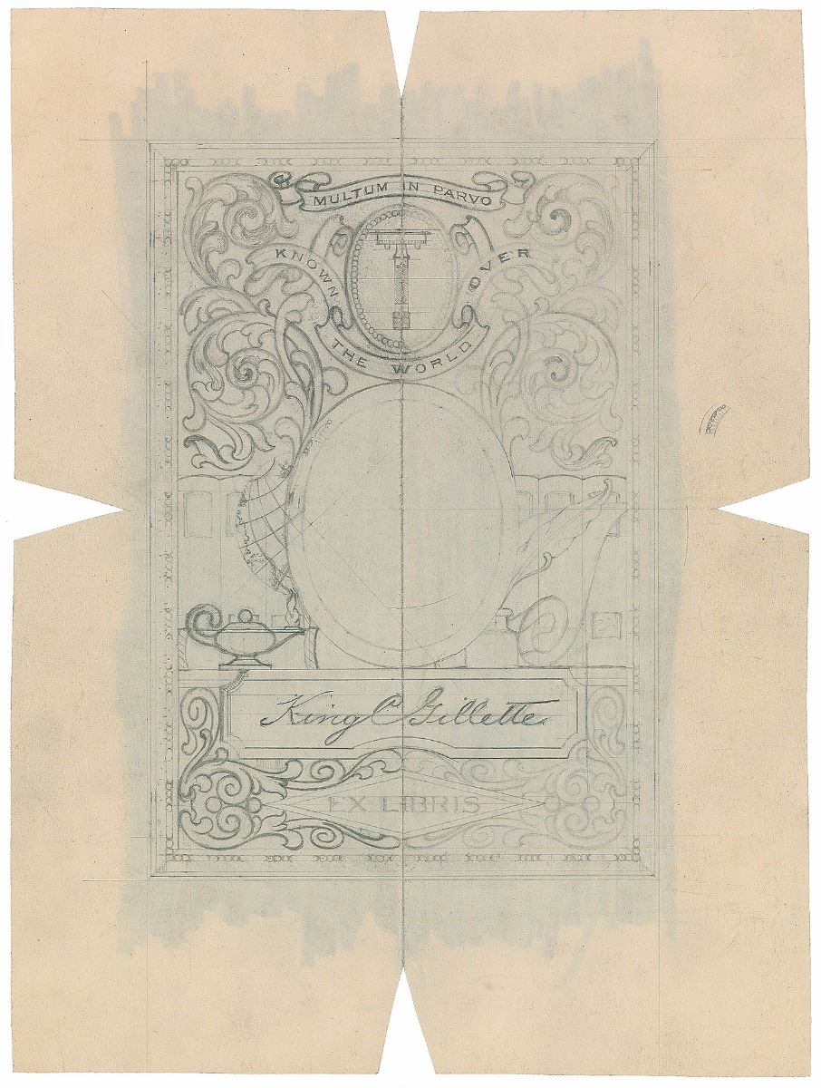American businessman (1855–1932) who invented a best-selling version of the safety razor and is widely credited with inventing the so-called razor and blades business model. Impressive assemblage of items related to the design of bookplates for King Gillette’s personal library, including: a detailed ALS, three pages on two sheets, 7.25 x 10.5, personal letterhead, July 10, 1928, in part: “I have tried to make a rough sketch showing the razor—as you have shown it—with an idea of what I would lie in the way of lettering Multium in Parvo—(much in little) above razor in a straight line. The razor on a clean background and made to be clear and distinct—scroll under razor oval—to contain ‘Known the World Over’—Then comes oval for trade mark picture and then my name in script—then across bottom in a panel Ex Libris—The filling in to be scroll work”; two pages of preliminary drawings, one being an artist’s proof and the other entirely in Gillette’s hand, with his signature present on three small sketches; and an ink signature, “King Gillette,” on an off-white 5 x 3 slip. Also included is a lithograph proof of a finished copy of the bookplate, with pencil notations below; a small photo of Gillette holding a derby hat; and two letters—one concerning the creation of the bookplates and another related to Gillette’s praise for a gifted razor. In overall fine condition.
