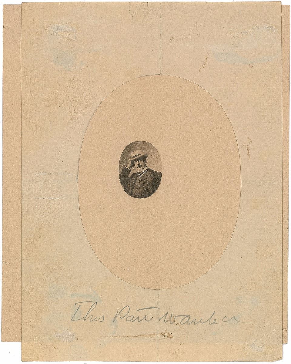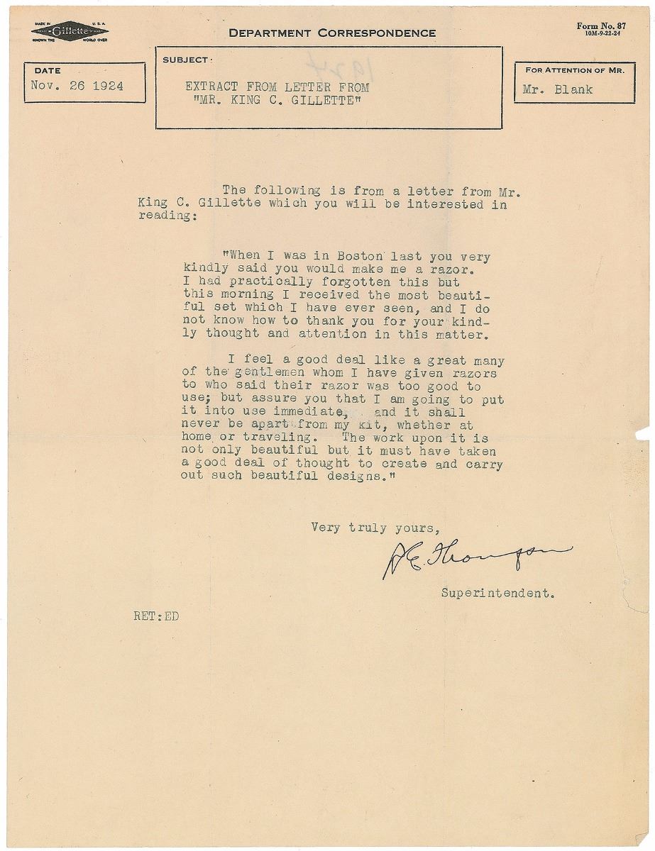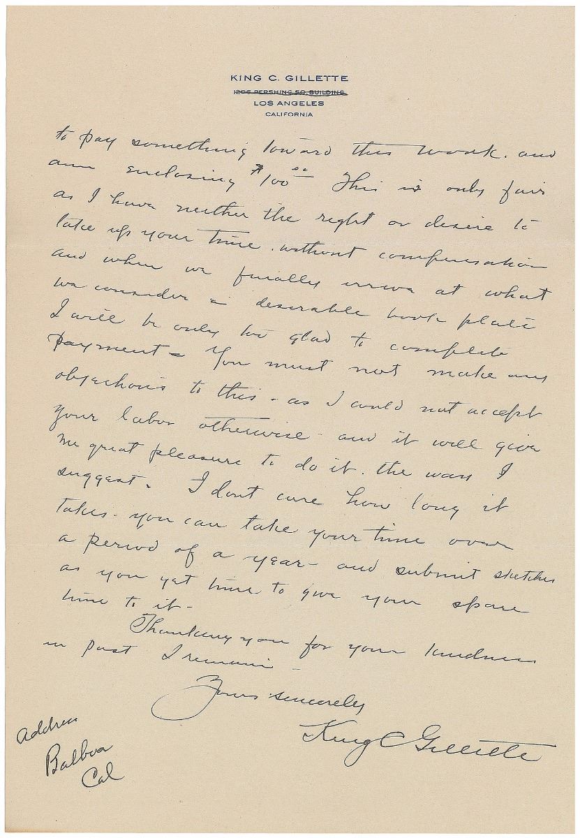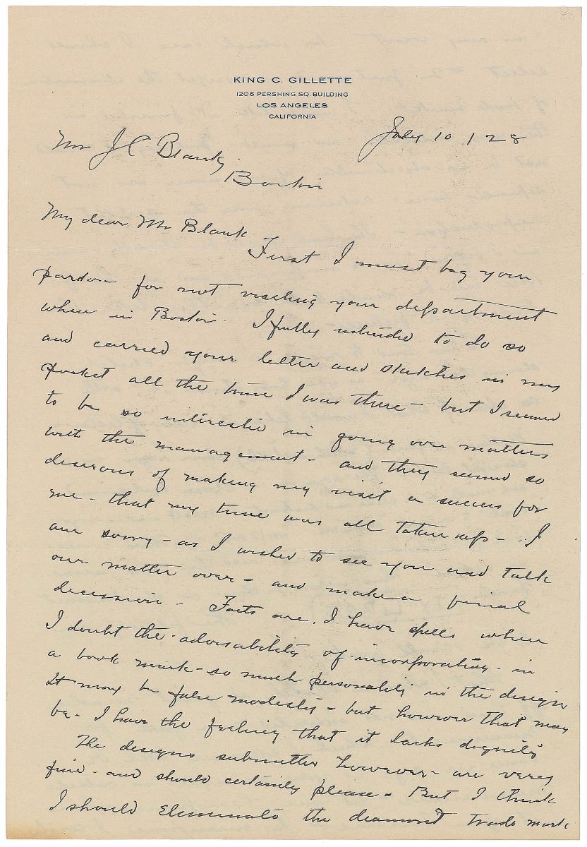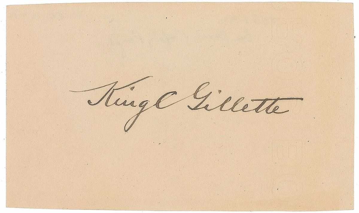 American businessman (1855–1932) who invented a best-selling version of the safety razor and is widely credited with inventing the so-called razor and blades business model. Impressive assemblage of items related to the design of bookplates for King Gillette’s personal library, including: a detailed ALS, three pages on two sheets, 7.25 x 10.5, personal letterhead, July 10, 1928, in part: “I have tried to make a rough sketch showing the razor—as you have shown it—with an idea of what I would lie in the way of lettering Multium in Parvo—(much in little) above razor in a straight line. The razor on a clean background and made to be clear and distinct—scroll under razor oval—to contain ‘Known the World Over’—Then comes oval for trade mark picture and then my name in script—then across bottom in a panel Ex Libris—The filling in to be scroll work”; two pages of preliminary drawings, one being an artist’s proof and the other entirely in Gillette’s hand, with his signature present on three small sketches; and an ink signature, “King Gillette,” on an off-white 5 x 3 slip. Also included is a lithograph proof of a finished copy of the bookplate, with pencil notations below; a small photo of Gillette holding a derby hat; and two letters—one concerning the creation of the bookplates and another related to Gillette’s praise for a gifted razor. In overall fine condition.