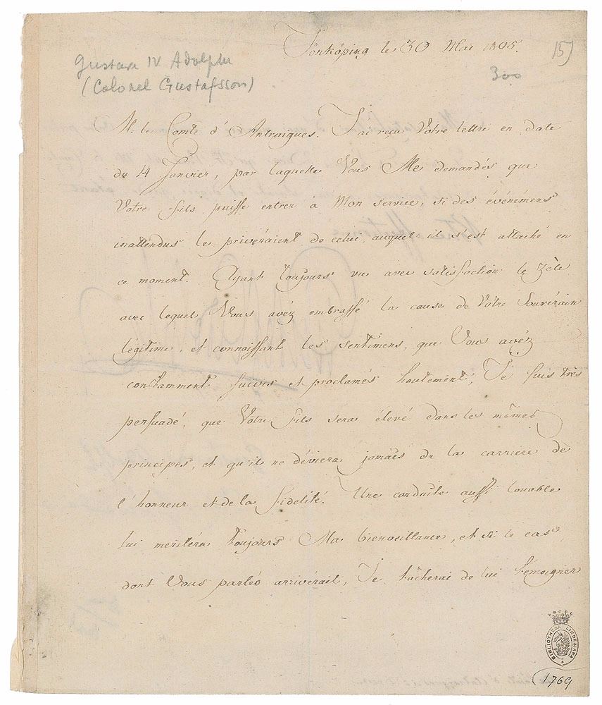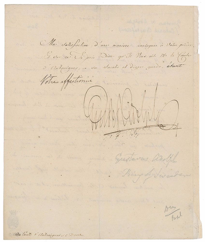 King of Sweden (1778–1837) from 1792 until his abdication in 1809, who was the son of Gustav III of Sweden and his queen consort Sophia Magdalena; he was the last Swedish ruler of Finland. Untranslated manuscript DS in French, signed “Gustaf Adolphe,” one page both sides, 7.25 x 8.75, May 30, 1805. In fine condition, with old mounting remnants along the left edge.