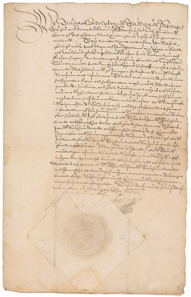 King of Sweden (born 1594) who reigned from 1611 to 1632, known for leading the nation to military supremacy during the Thirty Years War; an able military commander, he was killed at the Battle of Lutzen in 1632. Untranslated manuscript DS in Swedish, signed “Gustavus Adolphus,” one page, 8.25 x 13, June 25, 1622. The crisply embossed paper seal affixed below the signature remains fully intact and covers the signature if not folded. In very good condition, with intersecting folds and scattered dampstaining.