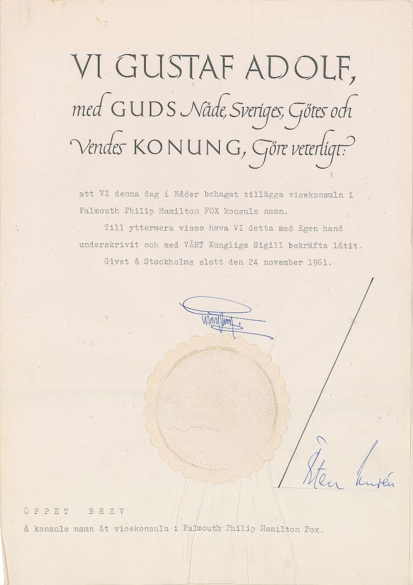 King of Sweden (born November 11, 1882) who reigned for twenty-two years until his death on September 15, 1973. DS, one page, 8.25 x 11.75, November 24, 1961. Document conferring the Swedish vice-consul at Falmouth, Mr. Philip Hamilton Fox. Signed above the seal in blue ballpoint by the king. The crisply embossed paper seal affixed below the signature remains fully intact. In fine condition, with seal-related wrinkling. Accompanied by a complete translation to French.