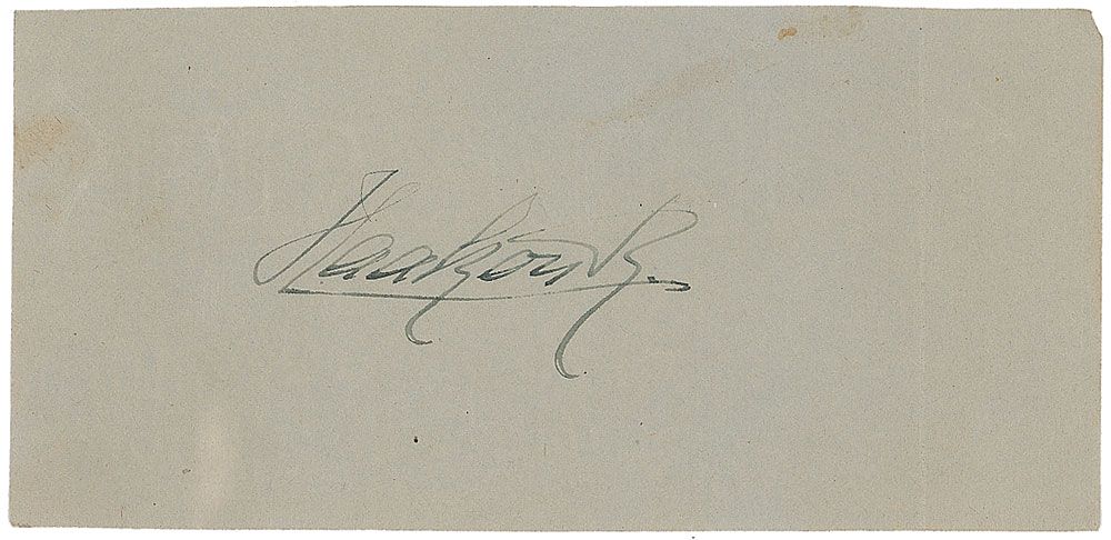 The first king of Norway (1872–1957) who ruled from 1905 until his death. Ink signature, “Haakon R,” on a light gray 5 x 2.5 slip. In fine condition, with a vertical fold to right side, not affecting the signature, and a small spot of soiling near top edge.