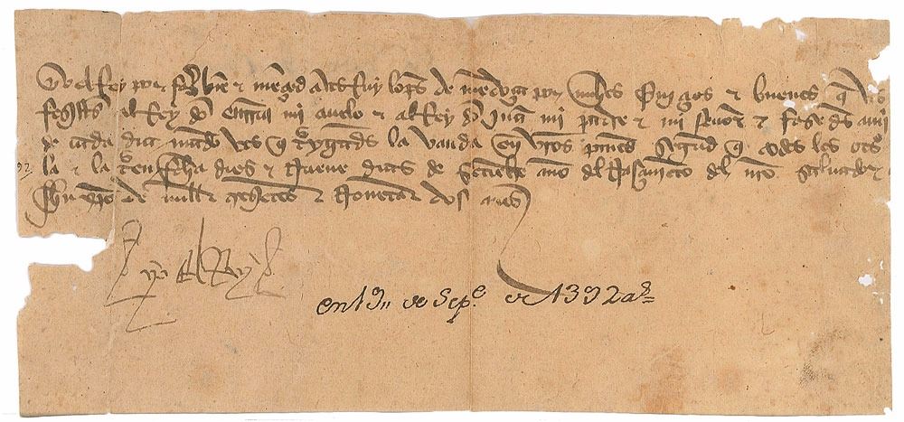 King of Castile and Leon who ruled from 1390 until his death at just 27 years old (1379–1406). Manuscript DS in Spanish, signed “Yo el Rey,” one page, 8.75 x 4, September 19, 1392. King Henry confirms the right of Ruy Lopez de Mendoza to wear a sash in acknowledgment of his services rendered to Kings John I and Henry. In very good condition, with paper loss to edges, and archival repair on the reverse to complete separation along the central vertical fold. Henry III, known as 'El Doliente,' was the son of John I and Eleanor of Aragon. His marriage to Catherine of Lancaster (the daughter of John of Gaunt, 1st Duke of Lancaster, and Constance of Castile) brought an end to the decade-old feud between the two dynasties. Despite his short reign, Henry III pursued an aggressive foreign policy and oversaw a powerful navy that won several victories against the English. A sought-after document over six centuries old.