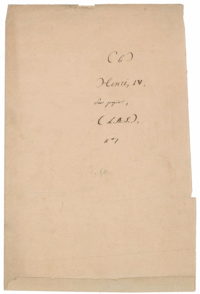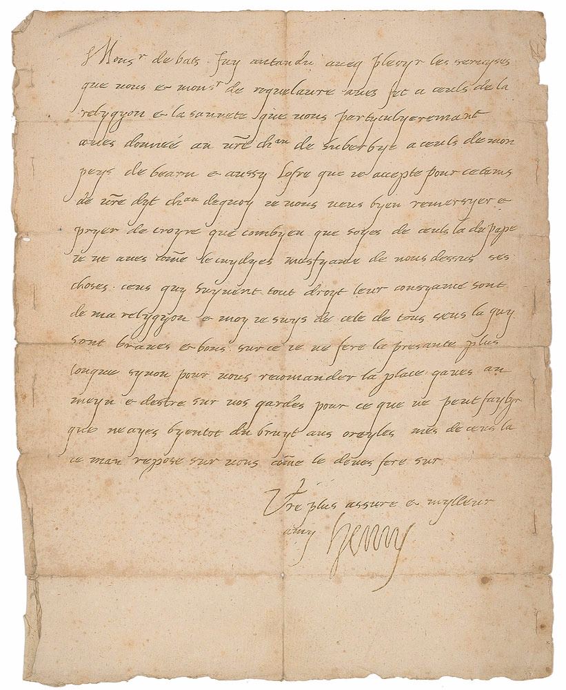 ALS in French, signed “Henry,” one page, 8.5 x 10.5, circa 1580. Letter to Monsieur de Batz, governor of the city of Eauze in Gascony, explaining his thoughts about his religion. In part (translated): "I have heard with pleasure the services which you and Monsieur de Roquelaure have done to those of religion, and the safety which you have particularly given in your castle of Suberbie to those of my country of Bearn, and also offer that I accept for this time from your said castle…Those who follow their conscience rightly are of my religion, and I am that of all those who are brave and good. With that, I will not make the present longer, except to recommend the place that you have in hand, and to be on your guard, for what can not fail that soon have no noise in the ears." In very good condition, with splitting along intersecting folds, scattered light foxing, and small slits along the side edges.