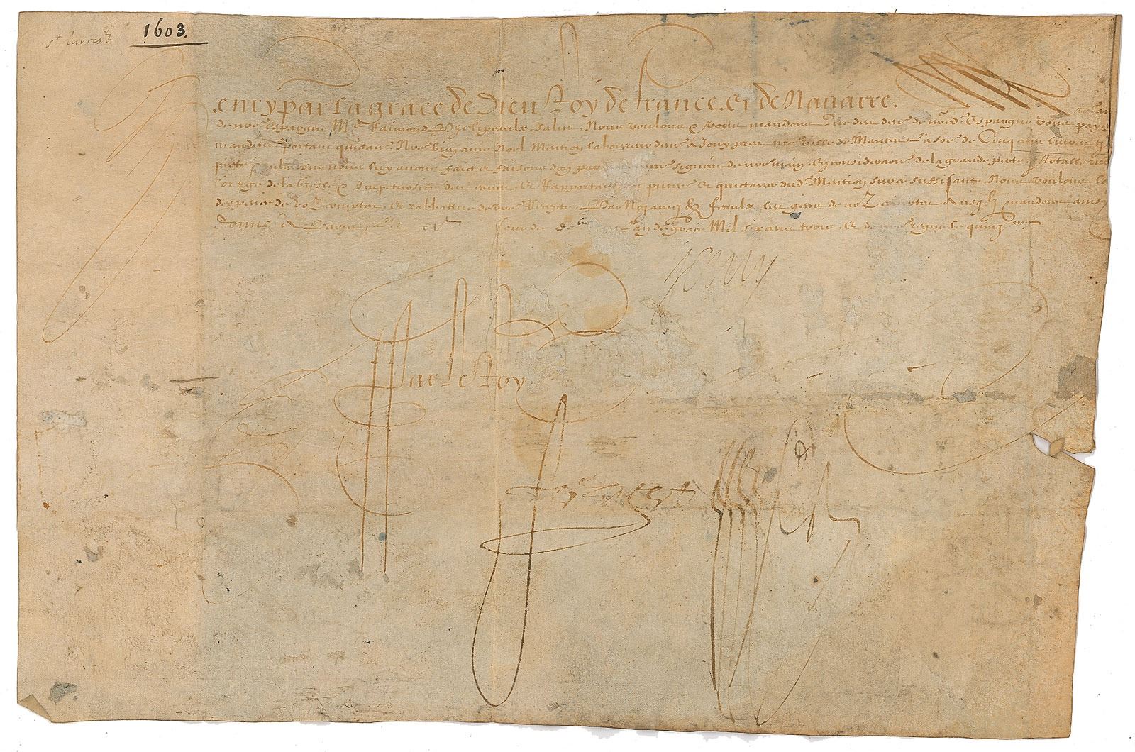 King of France (born 1553), the first of the Bourbon line, who ruled from 1589 until he was assassinated in 1610. Untranslated vellum manuscript DS in French, signed “Henry,” one page, 12.5 x 8.25, 1603. In very good condition, with overall soiling and light staining, a tear to the right edge, and Henry's signature light but entirely legible.