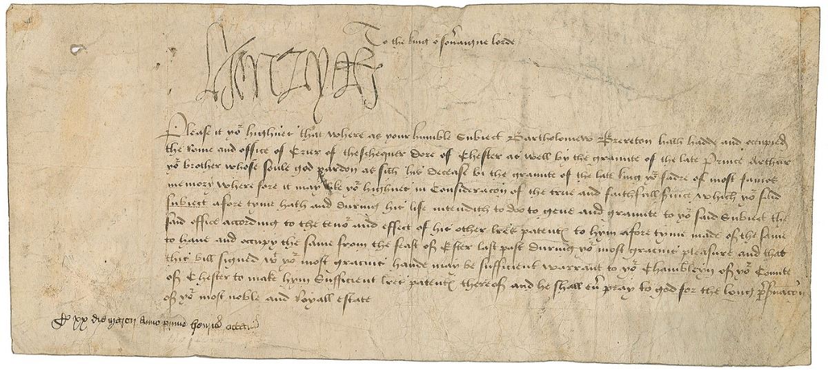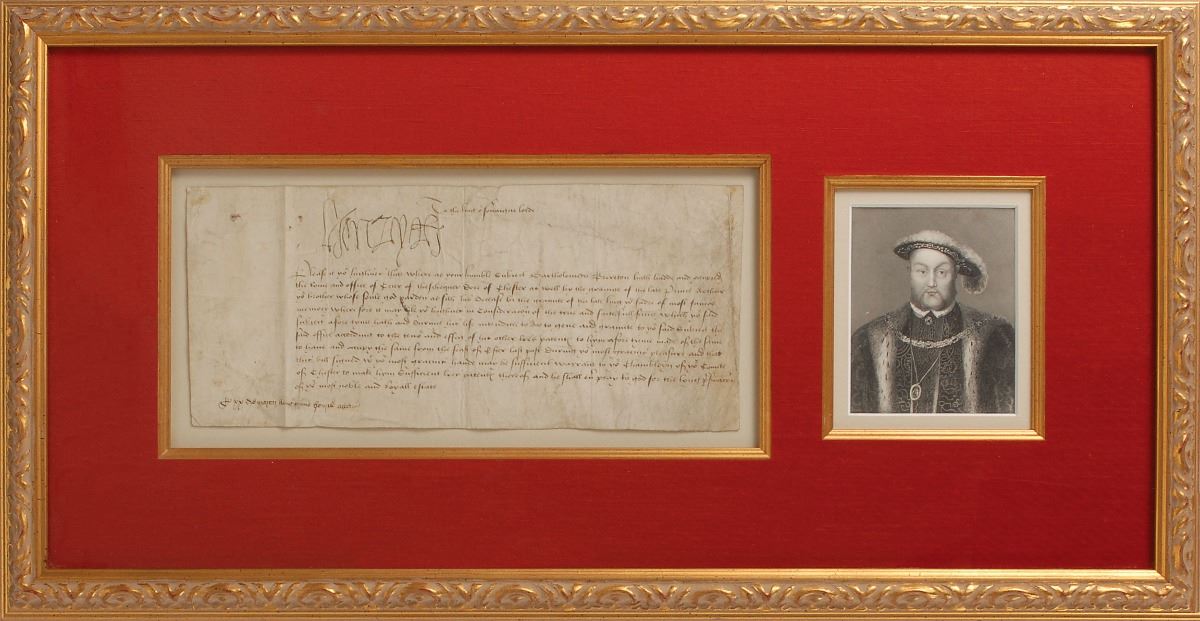 Rare and early manuscript DS, signed “Henry R,” one page, 11.5 x 5, March 20, 1509/10. Petition to grant Bartholomew Brereton an extension of his appointment to the office of the Crier of the Exchequer of Chester, in part: “Whereas your humble subject Bartholomew Brereton hath hadde and occupied the rome and office of Crier of theschequer dore of Chester as well by the grannte of the late Prince Arthur your brother...as sith his deathe by the grannte of the late king your fadre...that this bill signed with your most gracious hande may be sufficient warrant to your Chamberlyn of your county of Chester to make hym sufficient letters patente thereof.” Attractively and archivally cloth-matted and framed with an engraving of King Henry to an overall size of 25 x 13. In very good condition, with a small hole to upper left blank area and overall light soiling and wrinkling.