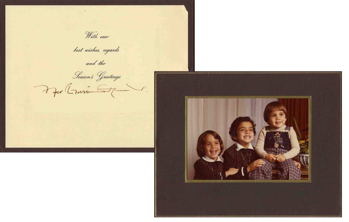 King Hussein of Jordan, who reigned from 1952-1999, signed holiday card. The regal card, which measures 9.5'' x 7.5'' and opens like a book, reads, ''With our best wishes, regards and the Season's Greetings / Hussein bin Talal''. Interior of card features a color photo of his three young children. Near fine condition.