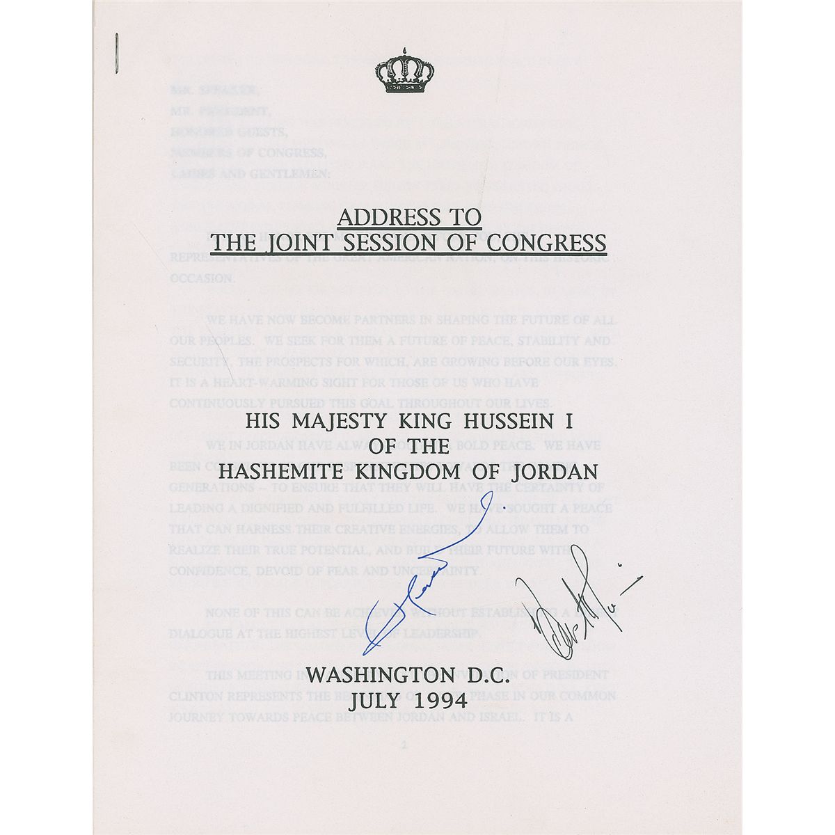 Printed copy of King Hussein’s address to the joint session of Congress, nine pages, 8.5 x 11, given in July of 1994. Signed on the front cover in blue and black ink by King Hussein and Queen Noor. In fine condition. Hussein and Israeli Prime Minister Yitzhak Rabin together addressed a joint session of the US Congress, the first time in history that two leaders did so. Their address came one day after the two met to sign the Washington Declaration, which formally ended the 46-year state of war between Jordan and Israel.
