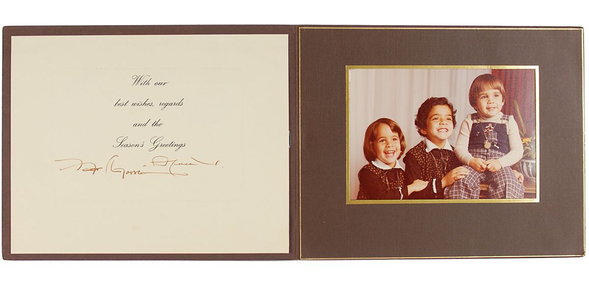 Holiday greeting card with an embossed crown on the front, measuring 20 x 8 open, featuring a color portrait of the royal children inside, signed in ink below a printed greeting on the opposite side by King Hussein and Queen Noor. In fine condition, with light wear to corners.
