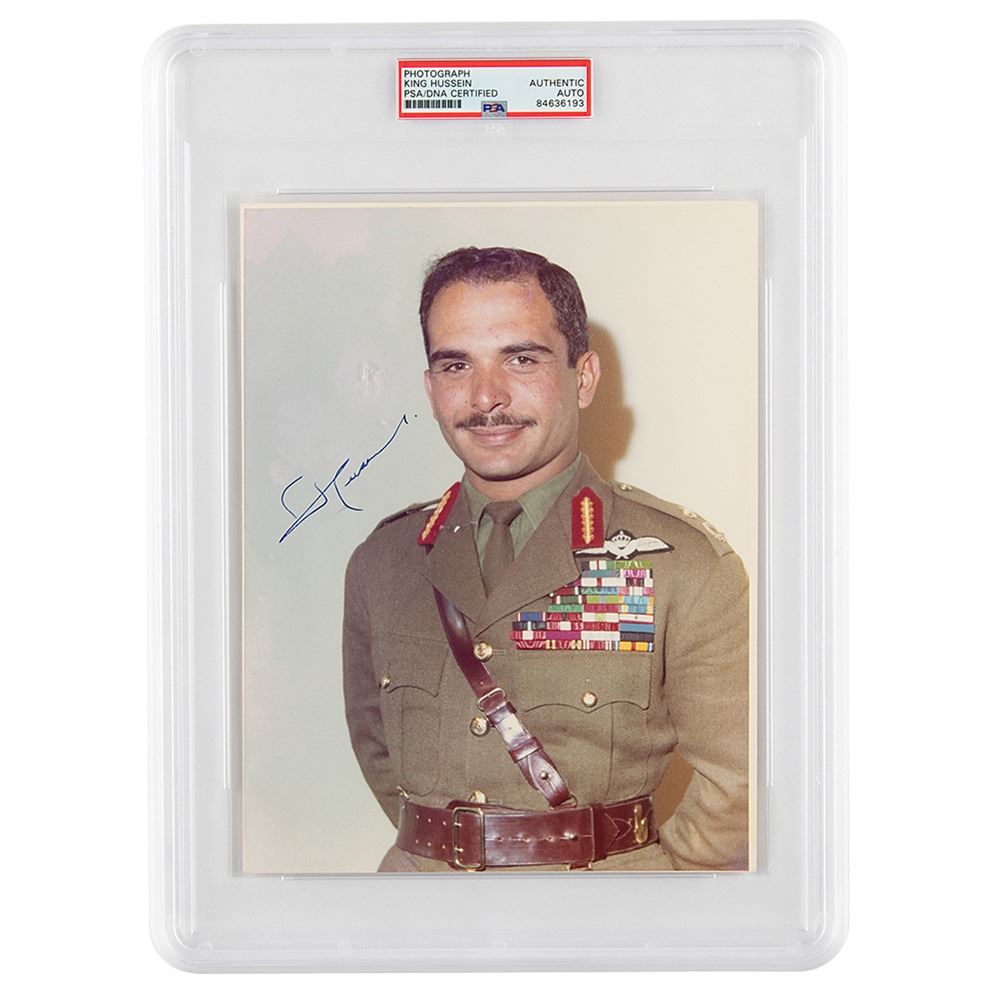 Color glossy 7 x 9.25 photo of King Hussein of Jordan in uniform, signed in blue felt tip. In very good condition, with overall creasing, including a noticeable central vertical crease. Encapsulated in a PSA/DNA authentication holder.
