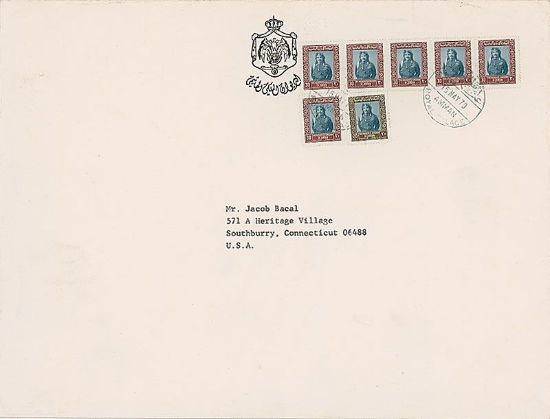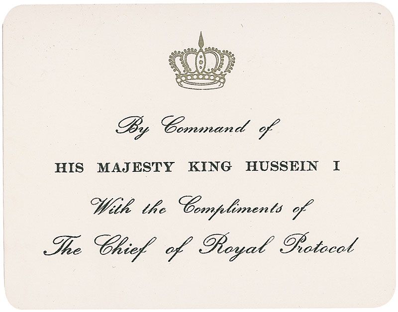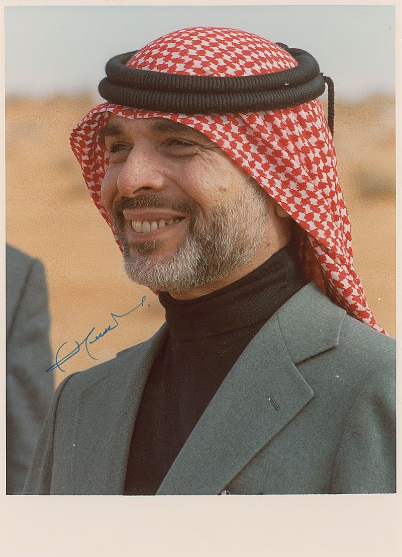 Color satin-finish 7.75 x 10.75 photo of King Hussein, signed in blue felt tip. In fine condition. Accompanied by a transmittal card from his office and the original mailing envelope.
