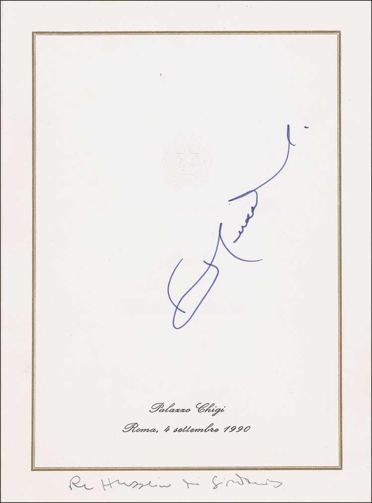Dinner menu, in Italian, 5 x 7, two pages, for an event held in Rome on September 4, 1990, nicely signed on the front cover in blue ink. In fine condition, with pencil notation along bottom of cover by Italian Prime Minister Giulio Andreotti who used to collect authographs for his son. RRAuction COA.