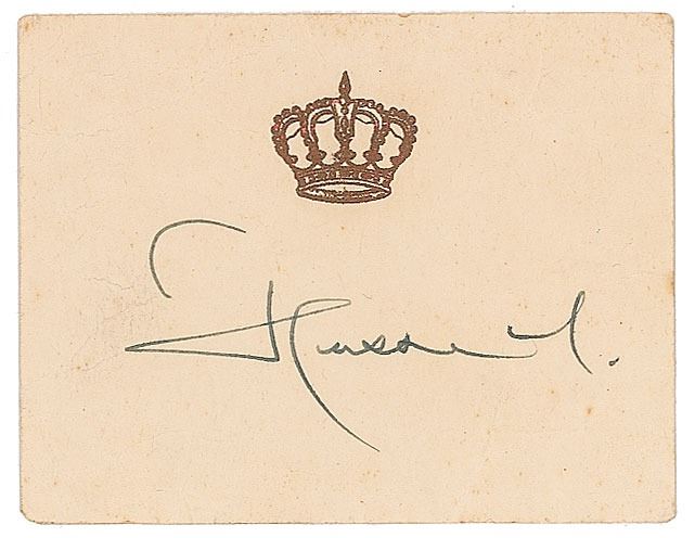 Two items: a fountain pen signature, "Hussein," on an off-white 3.5 x 2.75 card with embossed crown; and a biographical pamphlet for "His Majesty King Hussein I, The Hashemite Kingdom of Jordan," two pages, 8.25 x 11, signed and inscribed on the front cover in blue ballpoint, "To Marty, my warm wishes, Hussein." In overall very good to fine condition, with overall creasing to the signed card.